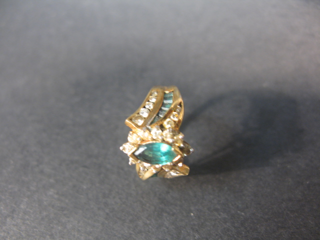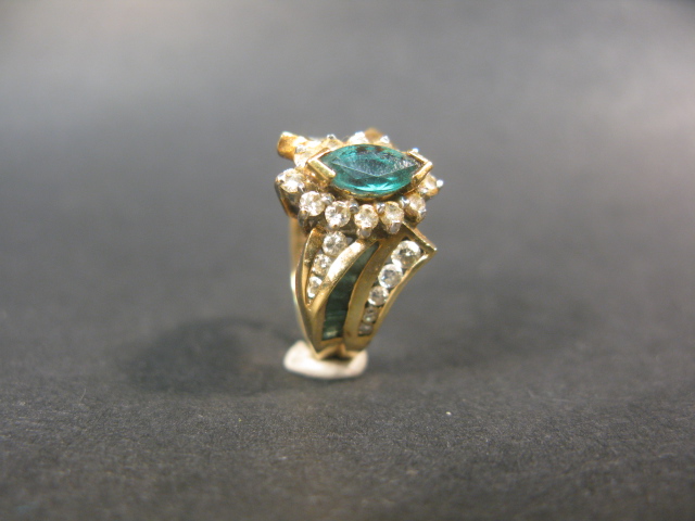 14K gold, emerald and diamond ring set with a center marquise shaped emerald.