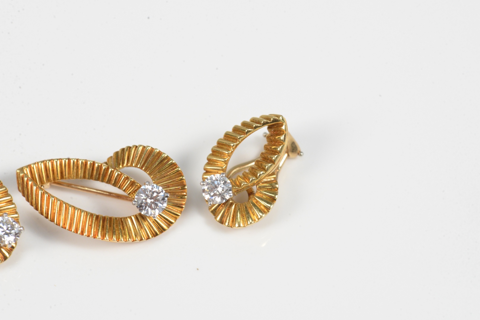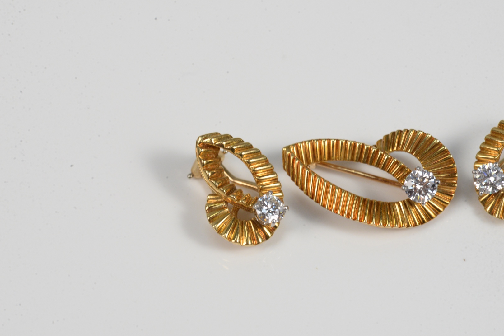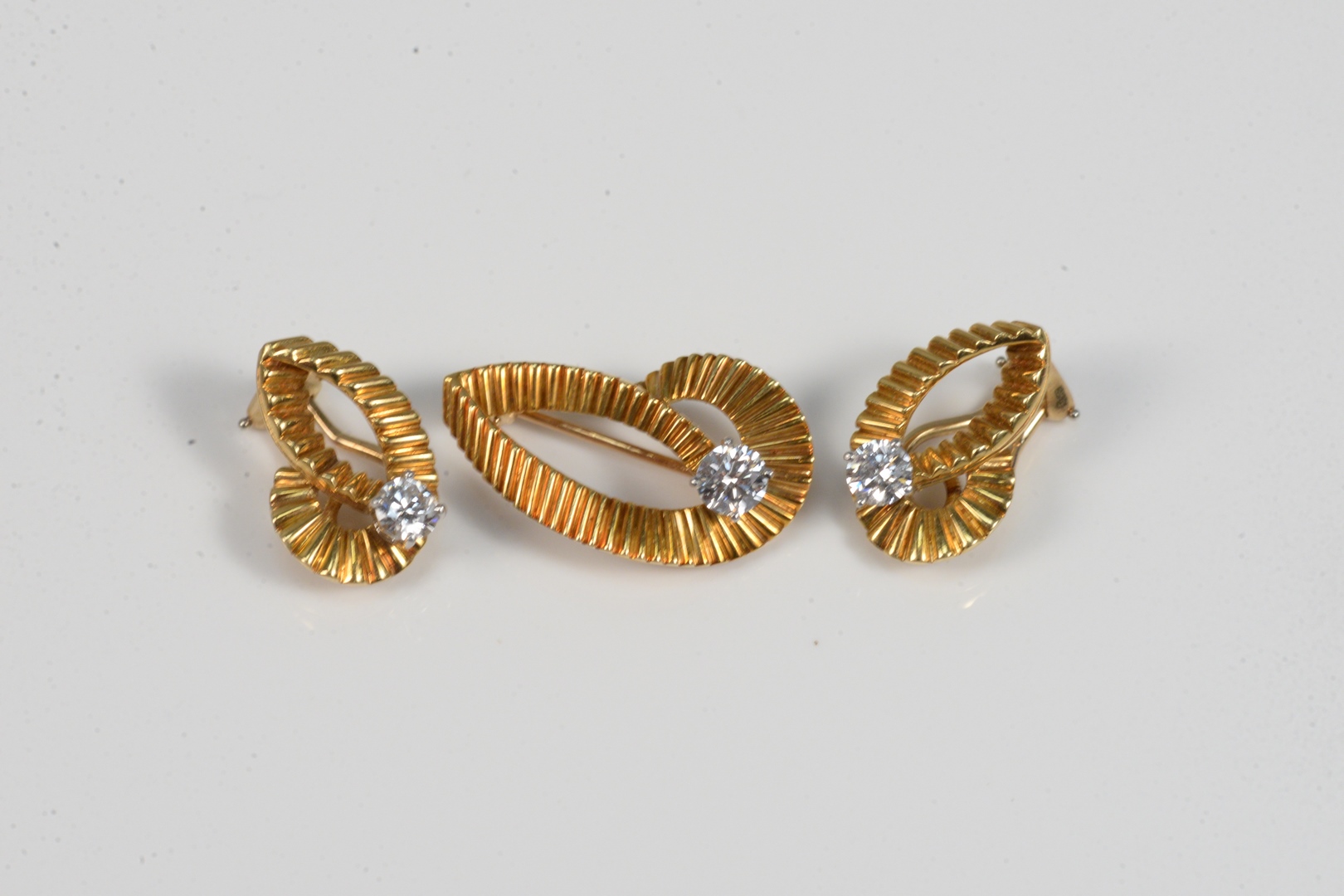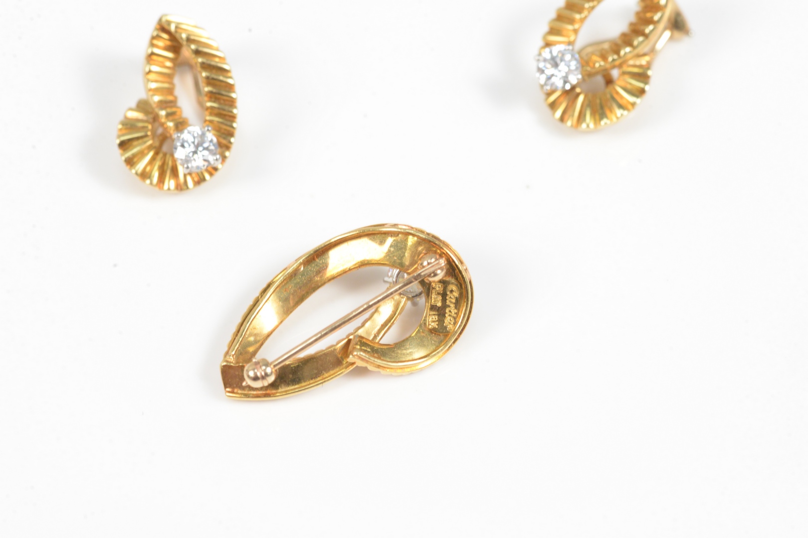 Lot 114: Cartier Three Piece 18 Karat Gold and Platinum Set Brooch set with diamonds approximately 1/2 carat, along with pair earrings, set…