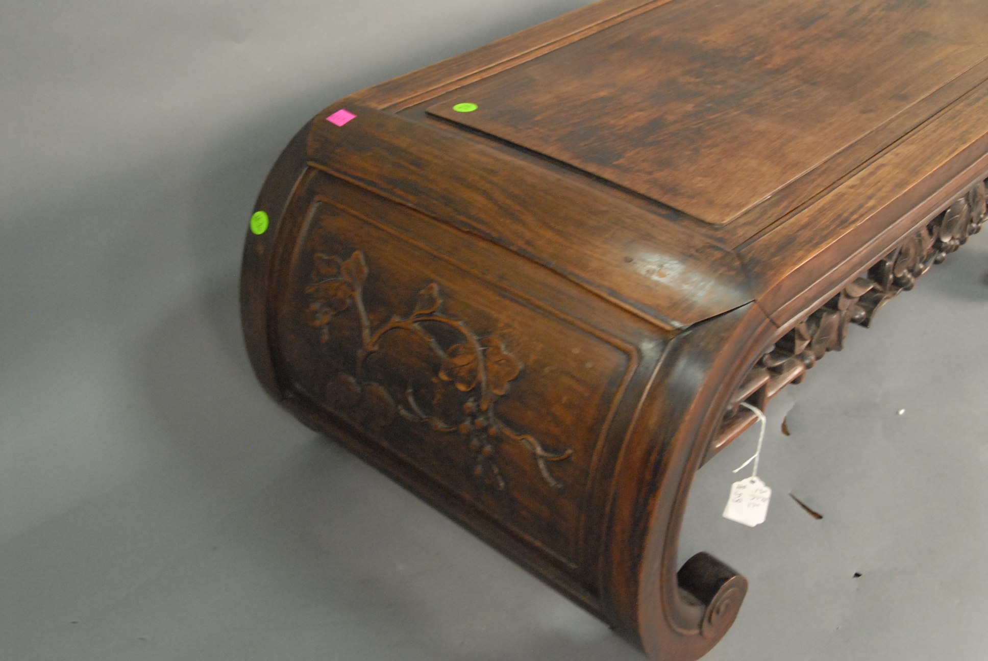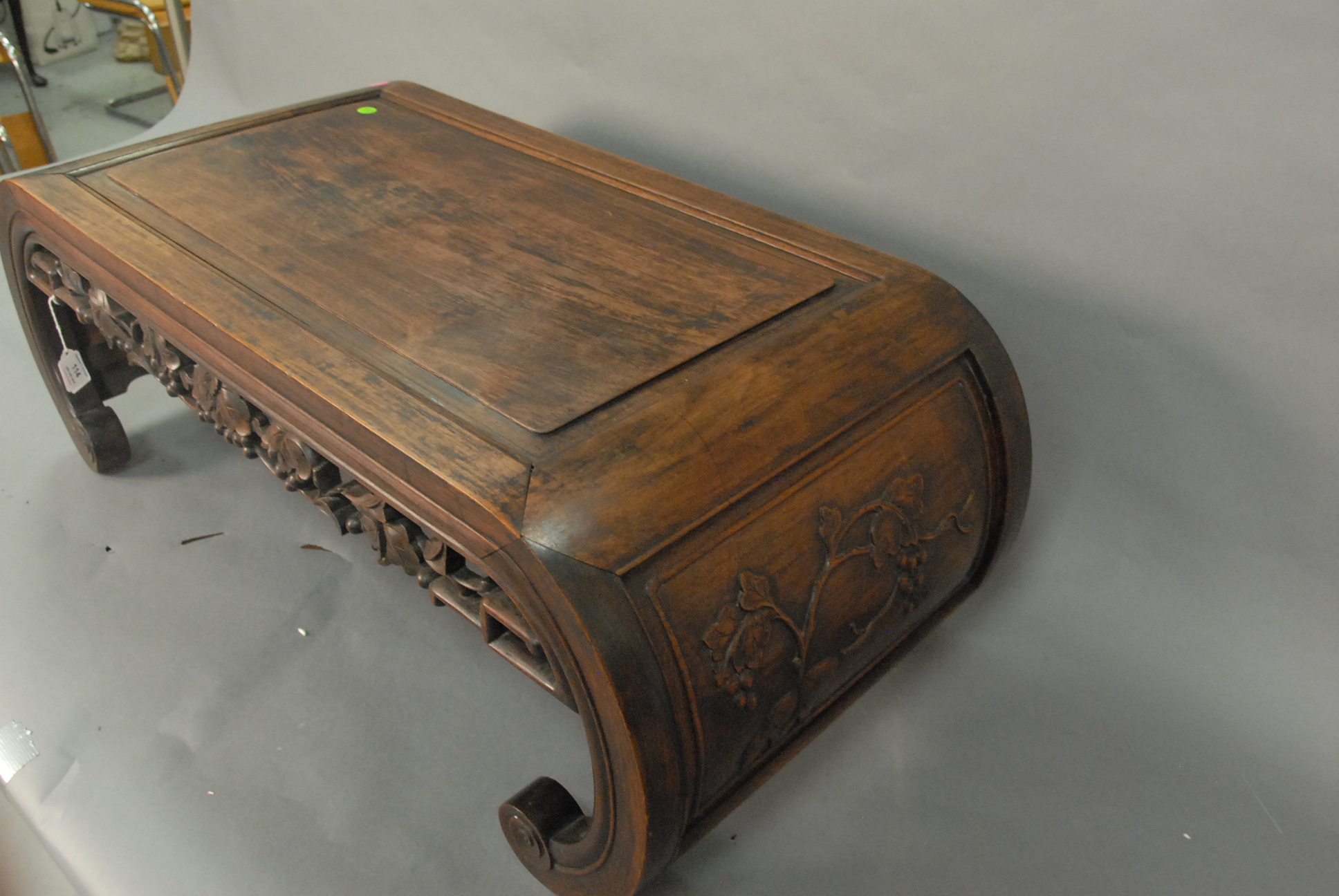 Lot 114: Carved teak table with rounded ends and reticulated carved skirt, ht. 13in. lg. 37in. wd. 17in.