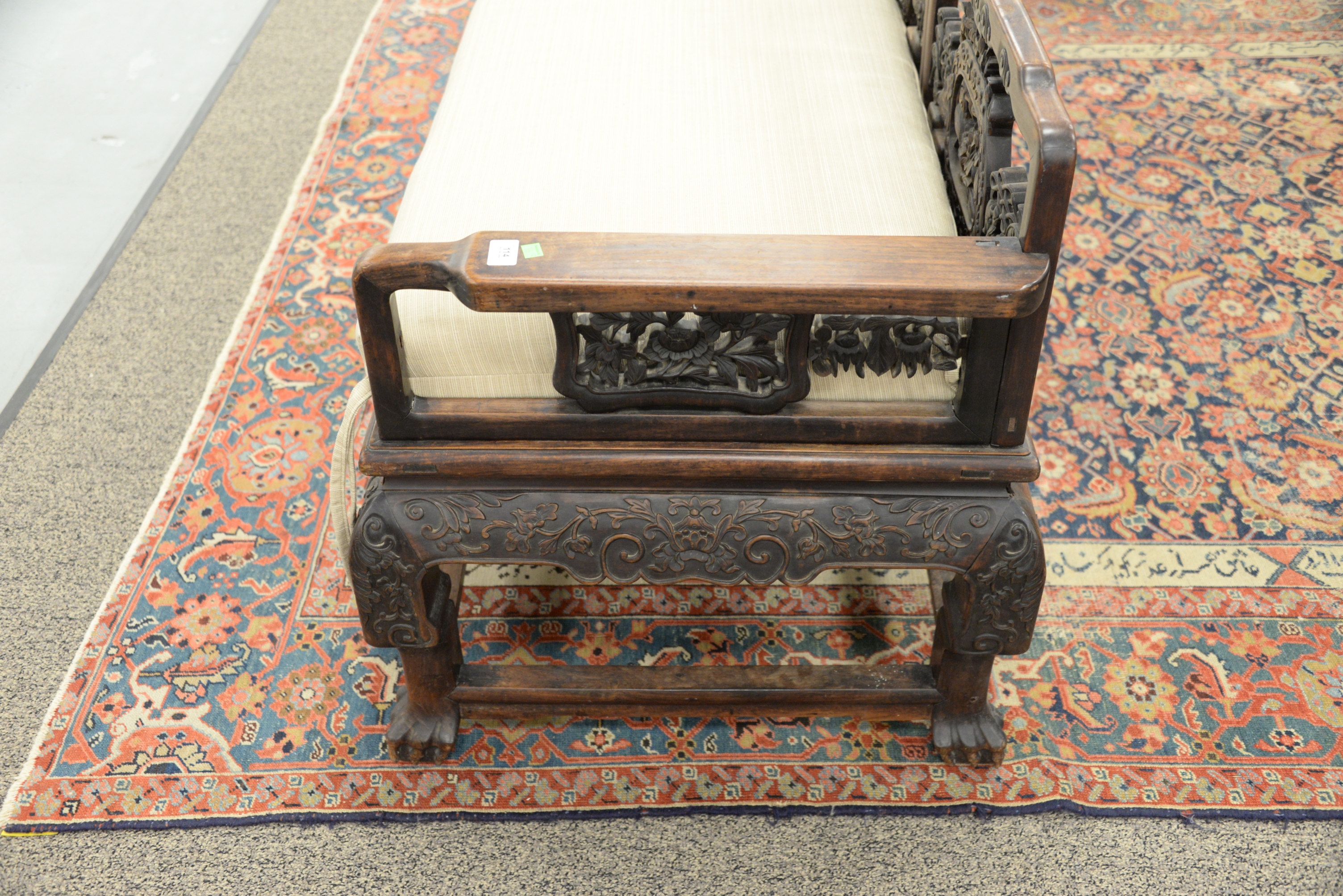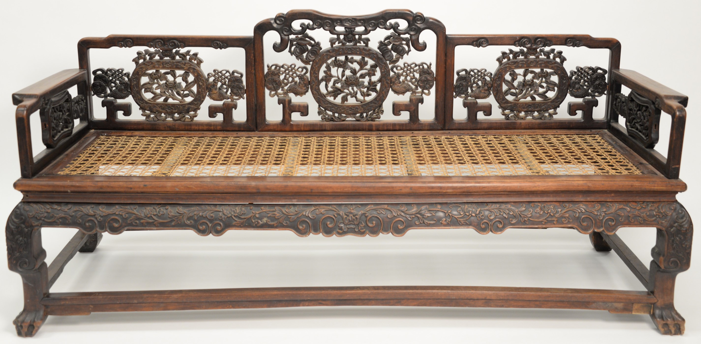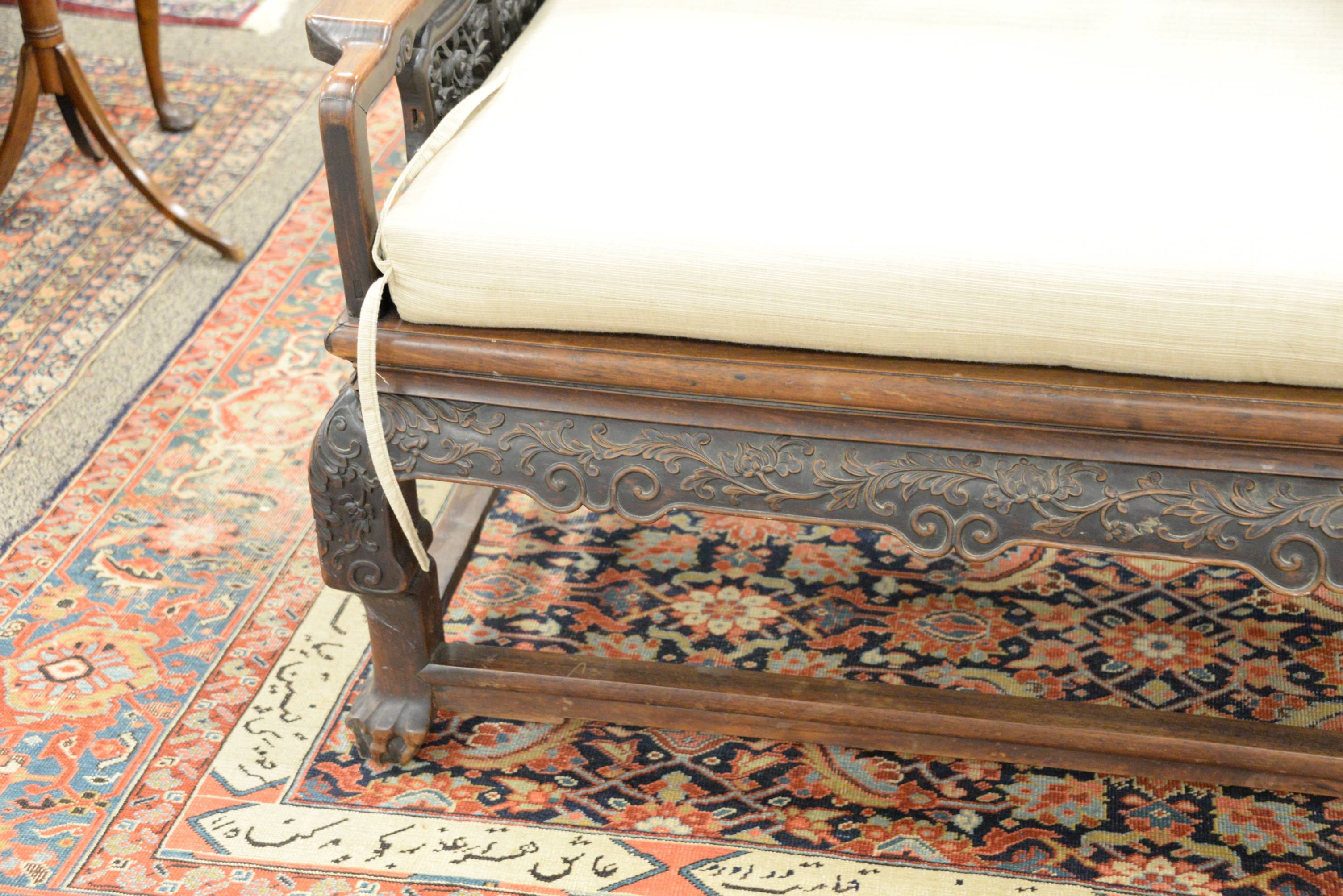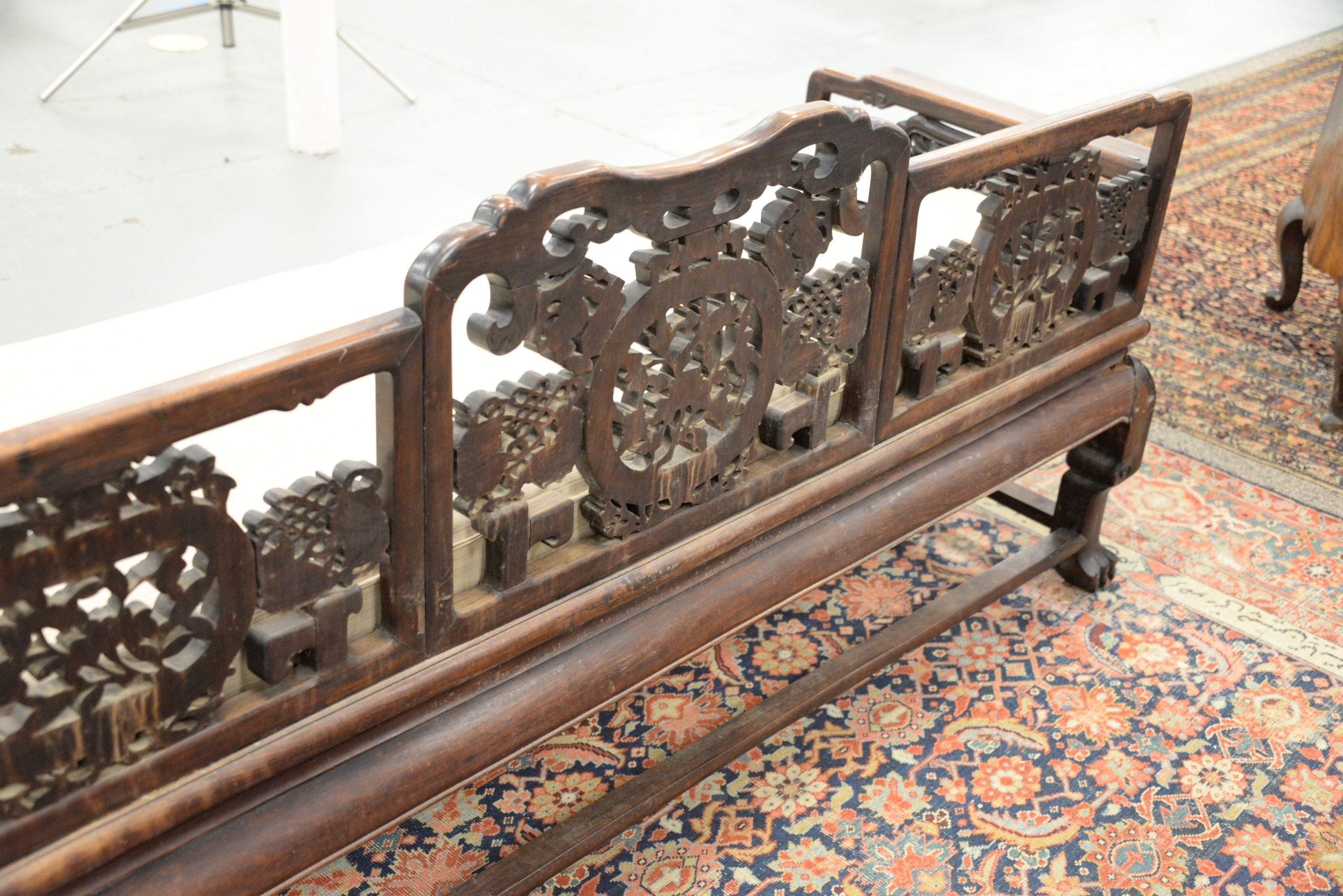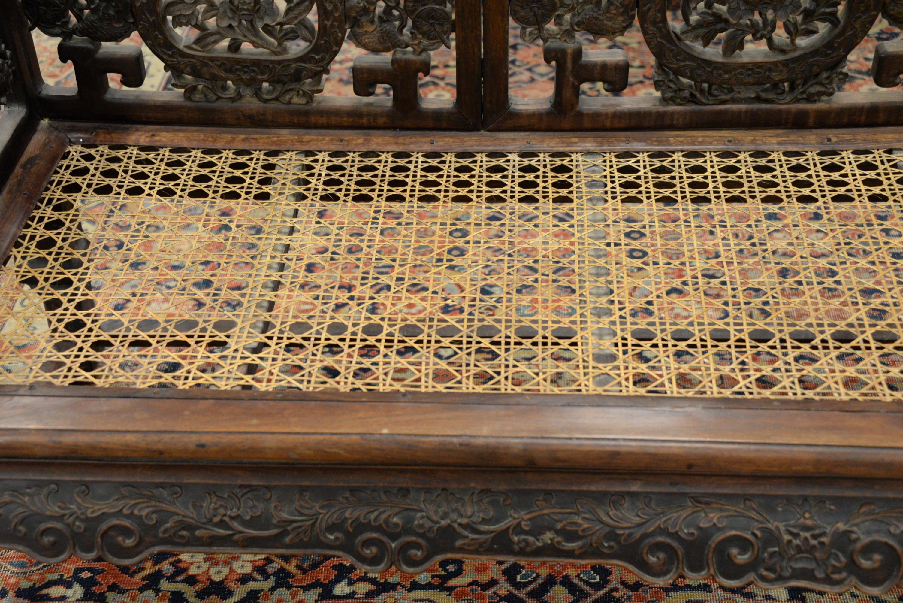Chinese Bench, having pierce carved back and sides, height 14 inches, length 80 inches, depth 27 inches. Provenance: A Private Connecticut Shoreline Collection