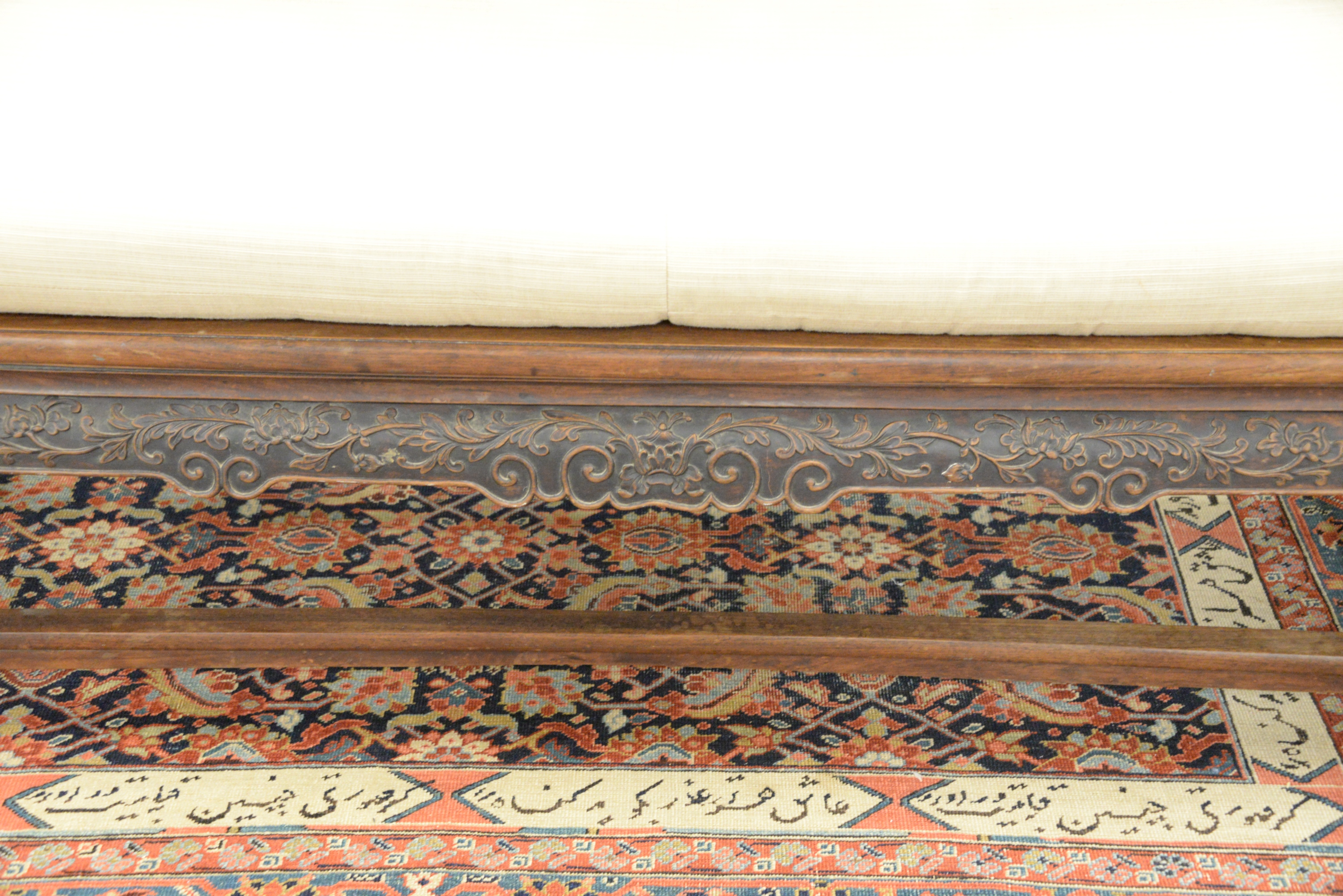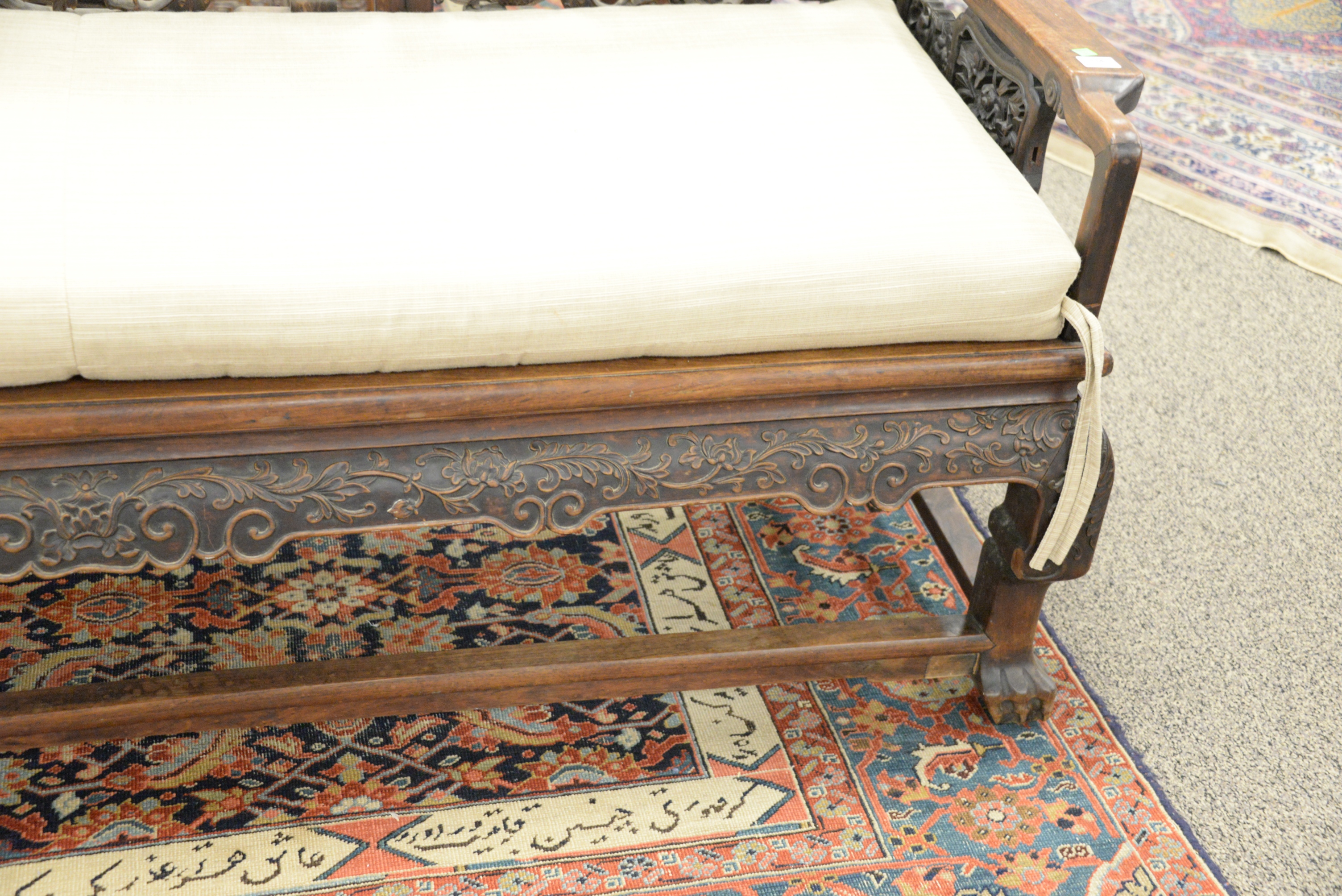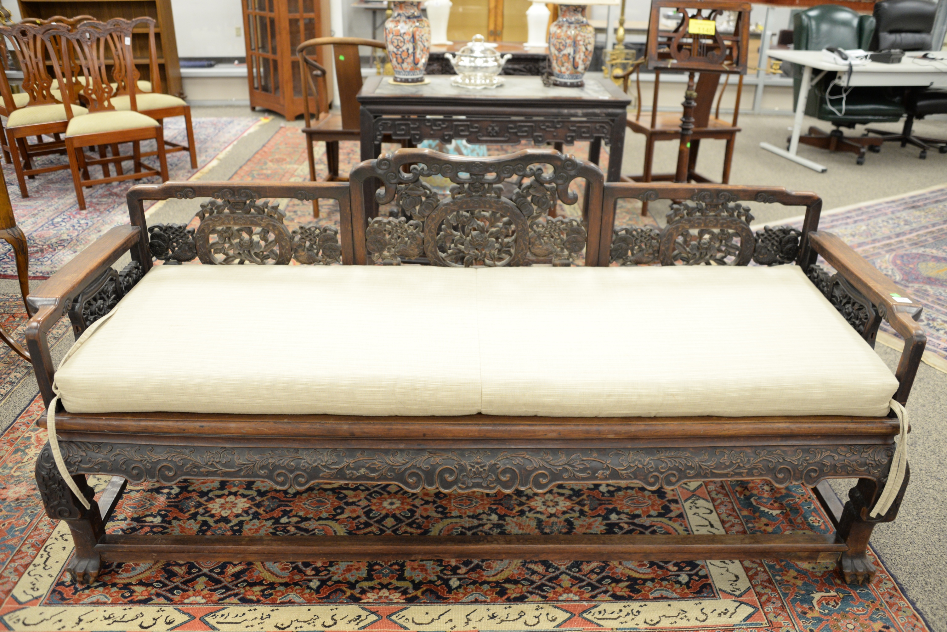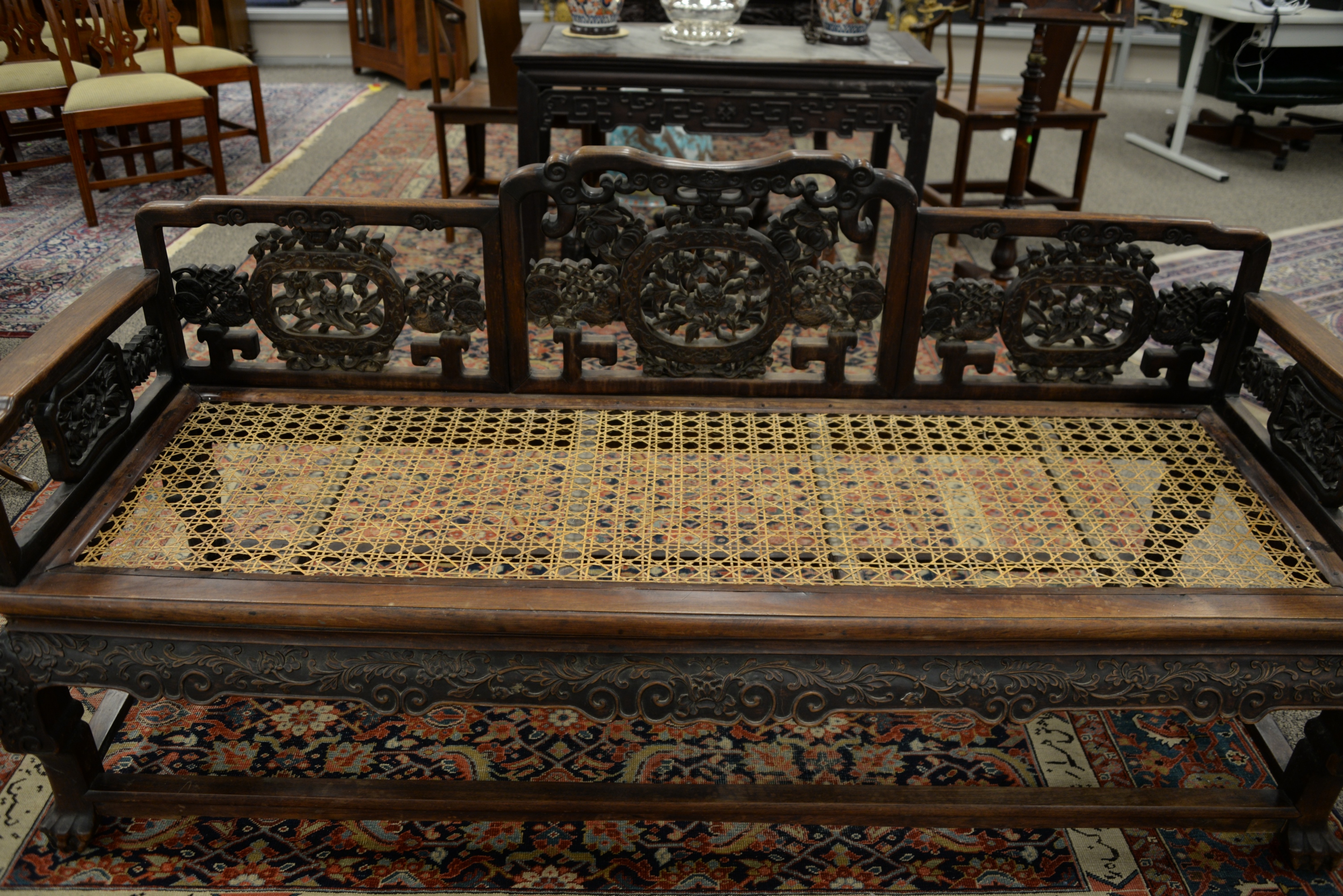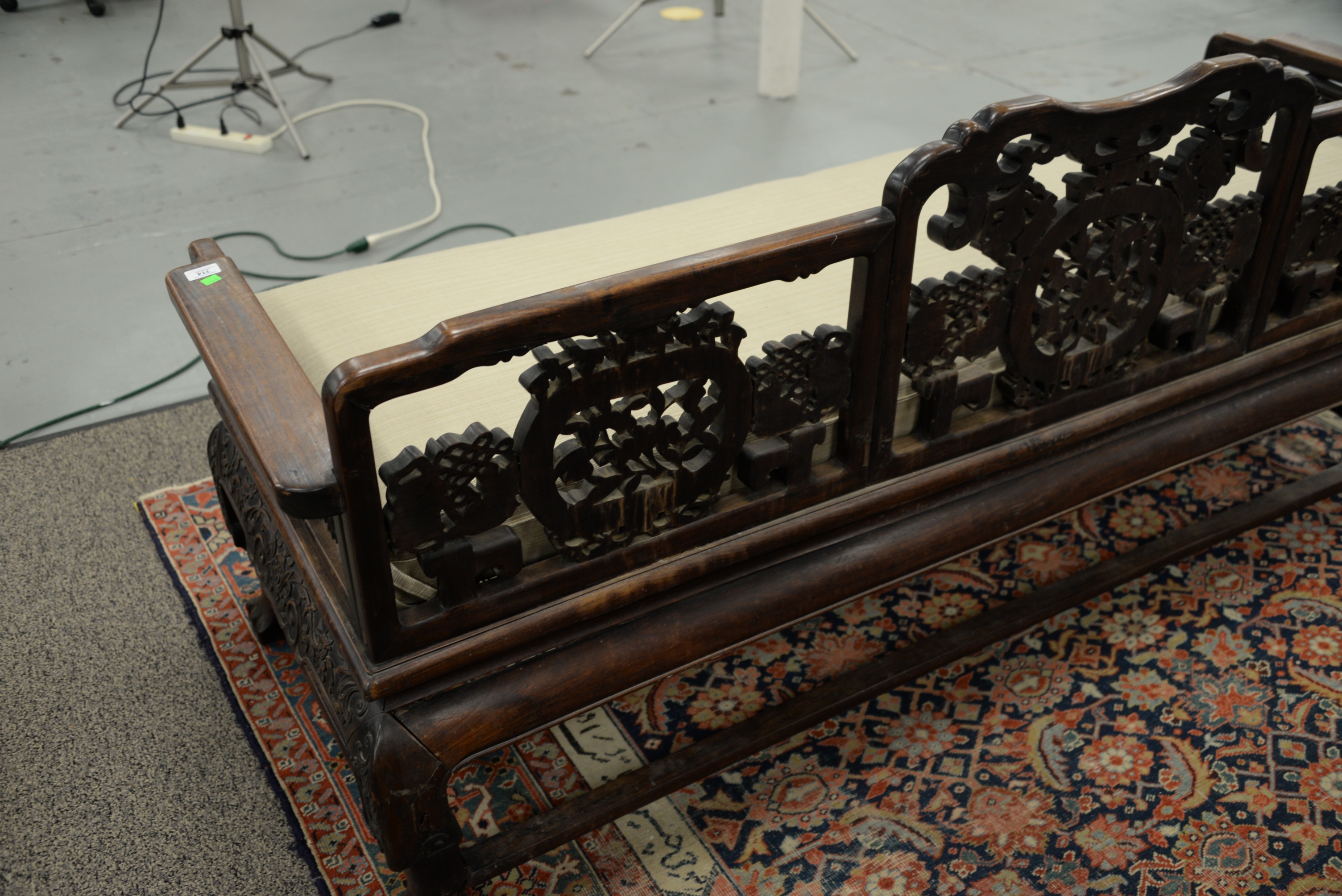 Chinese Bench, having pierce carved back and sides, height 14 inches, length 80 inches, depth 27 inches. Provenance: A Private Connecticut Shoreline Collection