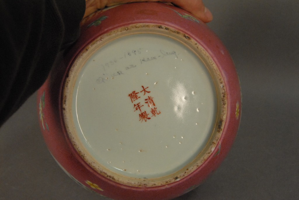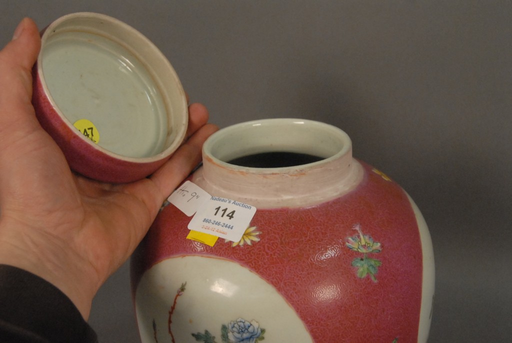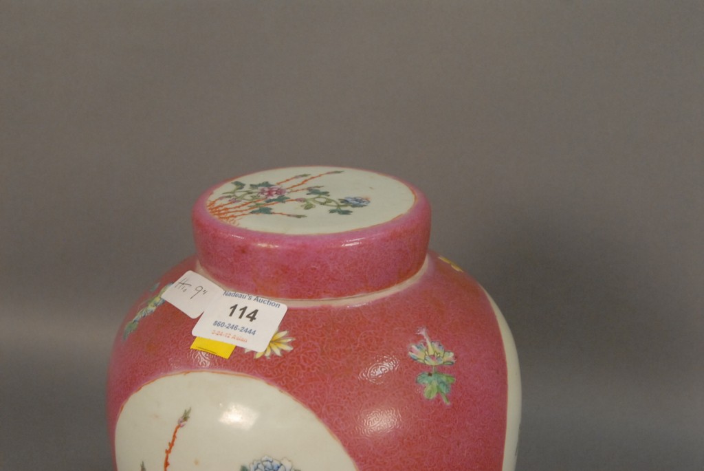 Lot 114: Chinese Famille Rose porcelain ginger jar and cover, floral decorated, six character mark on bottom, early 19th century, ht. 9.