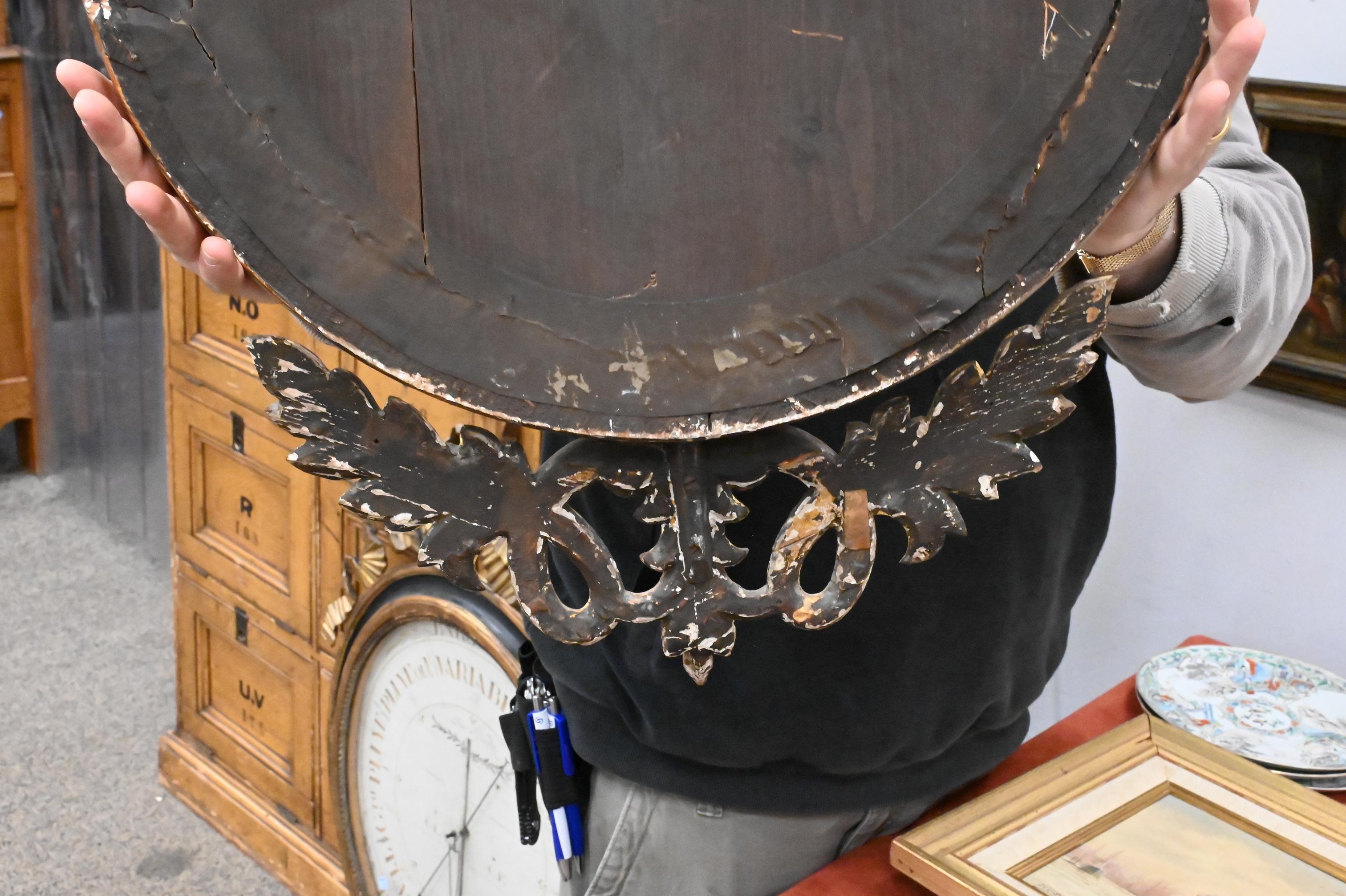 central round mirror surrounded by gilt sphere mounts surmounted by eagle with outstretched wings and flanked by scrolling foliate, gilt loss