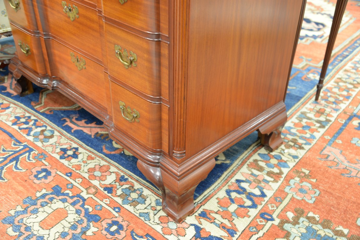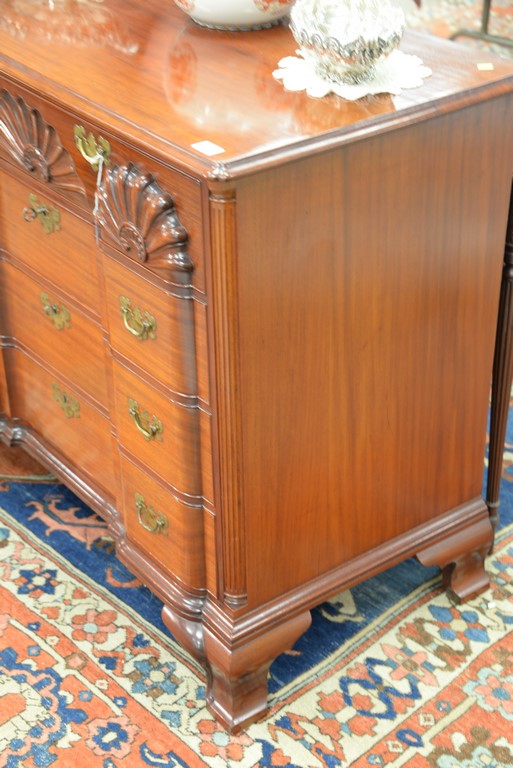 Fineberg mahogany four drawer chest having triple shell carved top drawer over three blocked front drawers, flanked by fluted columns and set on ogee bracket feet. chest: ht. 36 in. wd. 42 in. dp. 22 in.