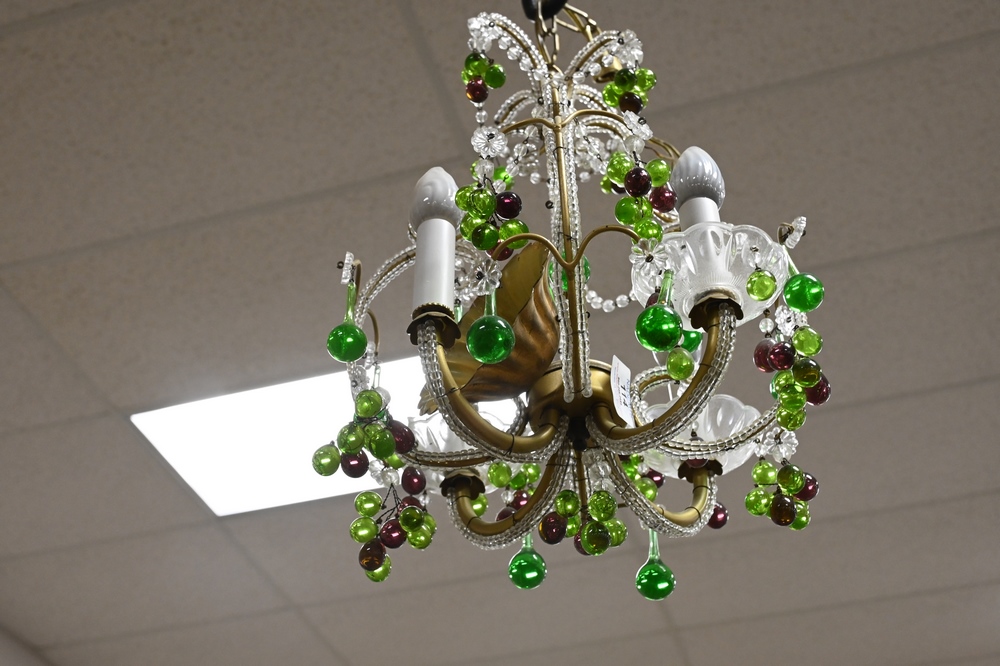 Lot 114: Four Light Chandelier, having clear glass beads with amethyst and green drops.