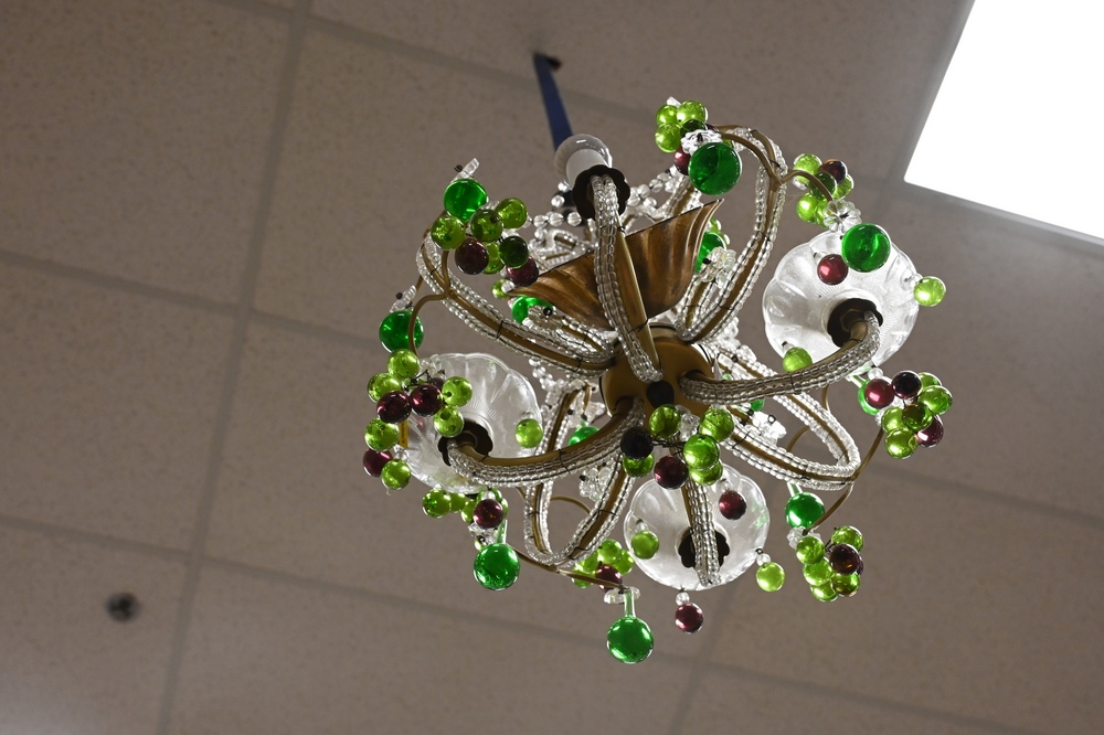 Four Light Chandelier, having clear glass beads with amethyst and green drops.