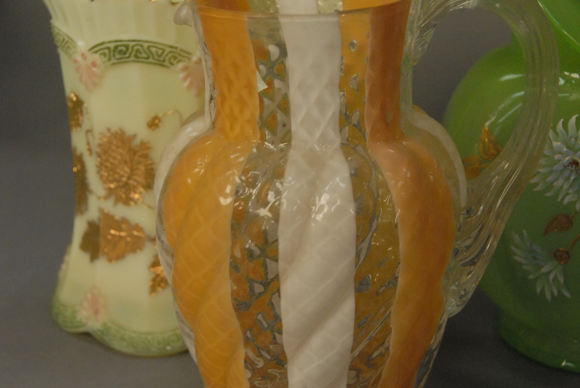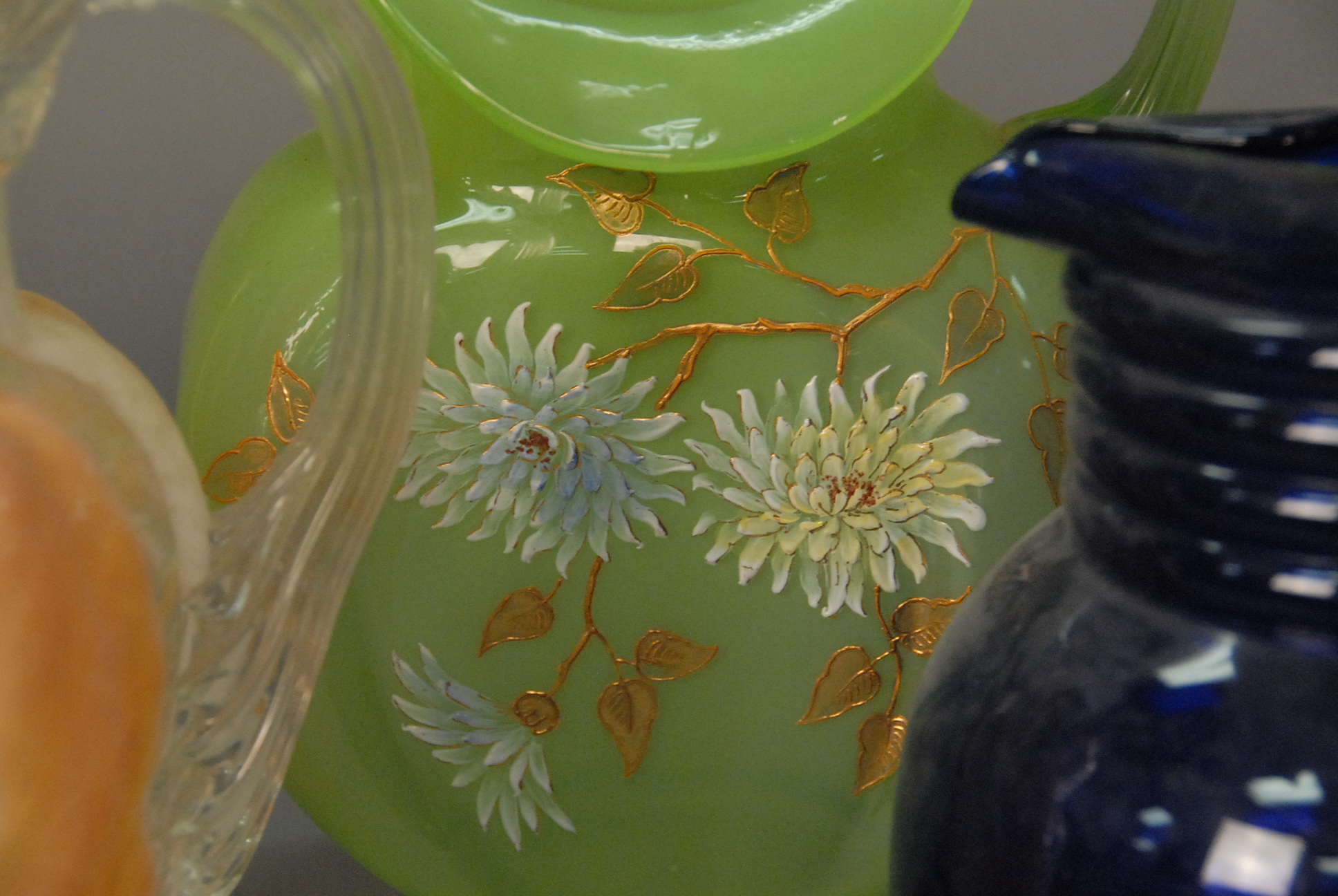 Lot 114: Group of four glass pitchers to include one green glass pitcher with enameled flowers and one peach and white art glass, ht. 7in. – …