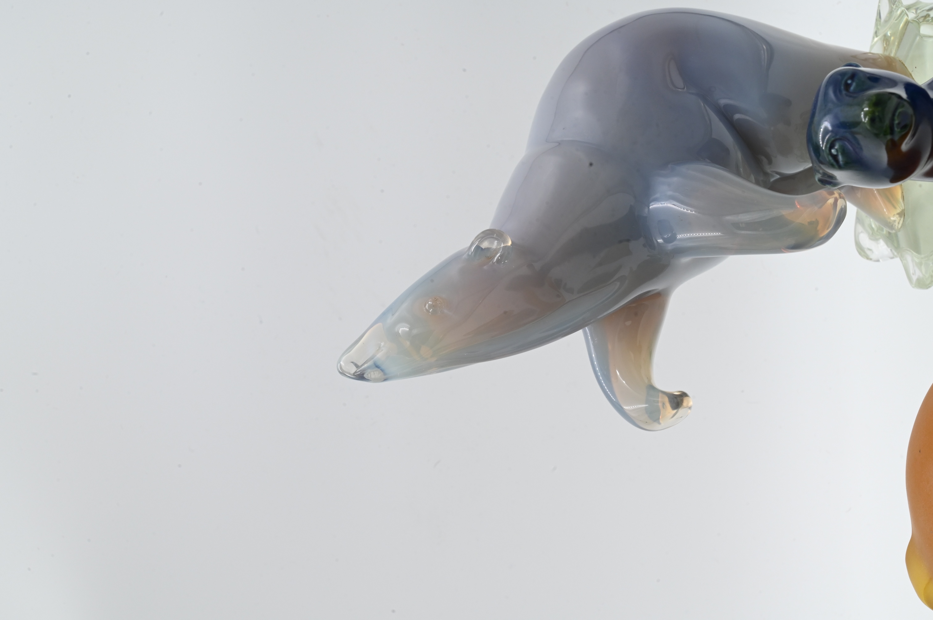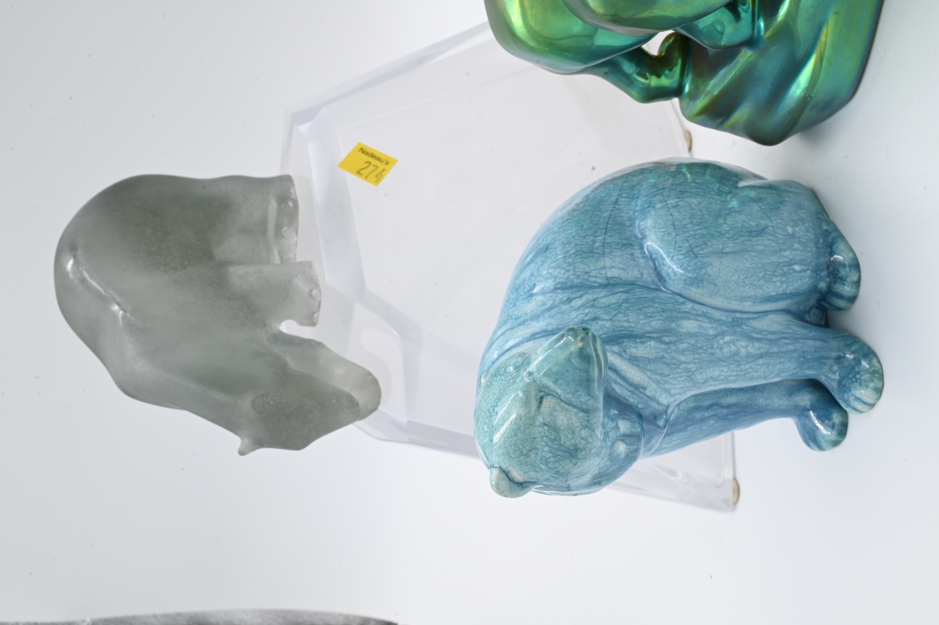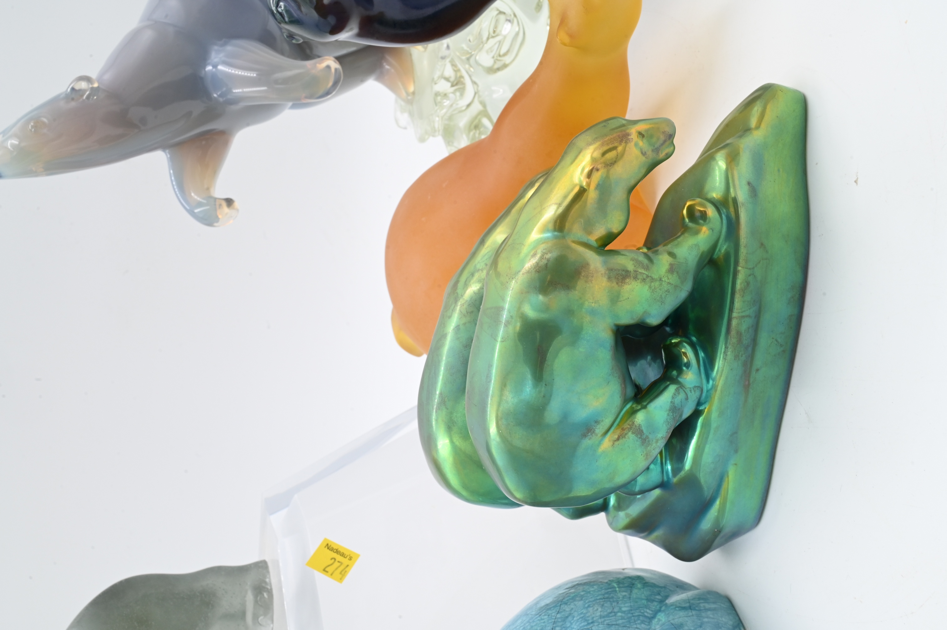 Mihaly Nagy for Zsolnay Hungary green iridescent eosin glaze, Daum France polar bear on iceberg, Monton England porcelain polar bear, Sascha Brastoff lucite polar bear, glass bear on iceberg signed on base, iridescent blue polar bear