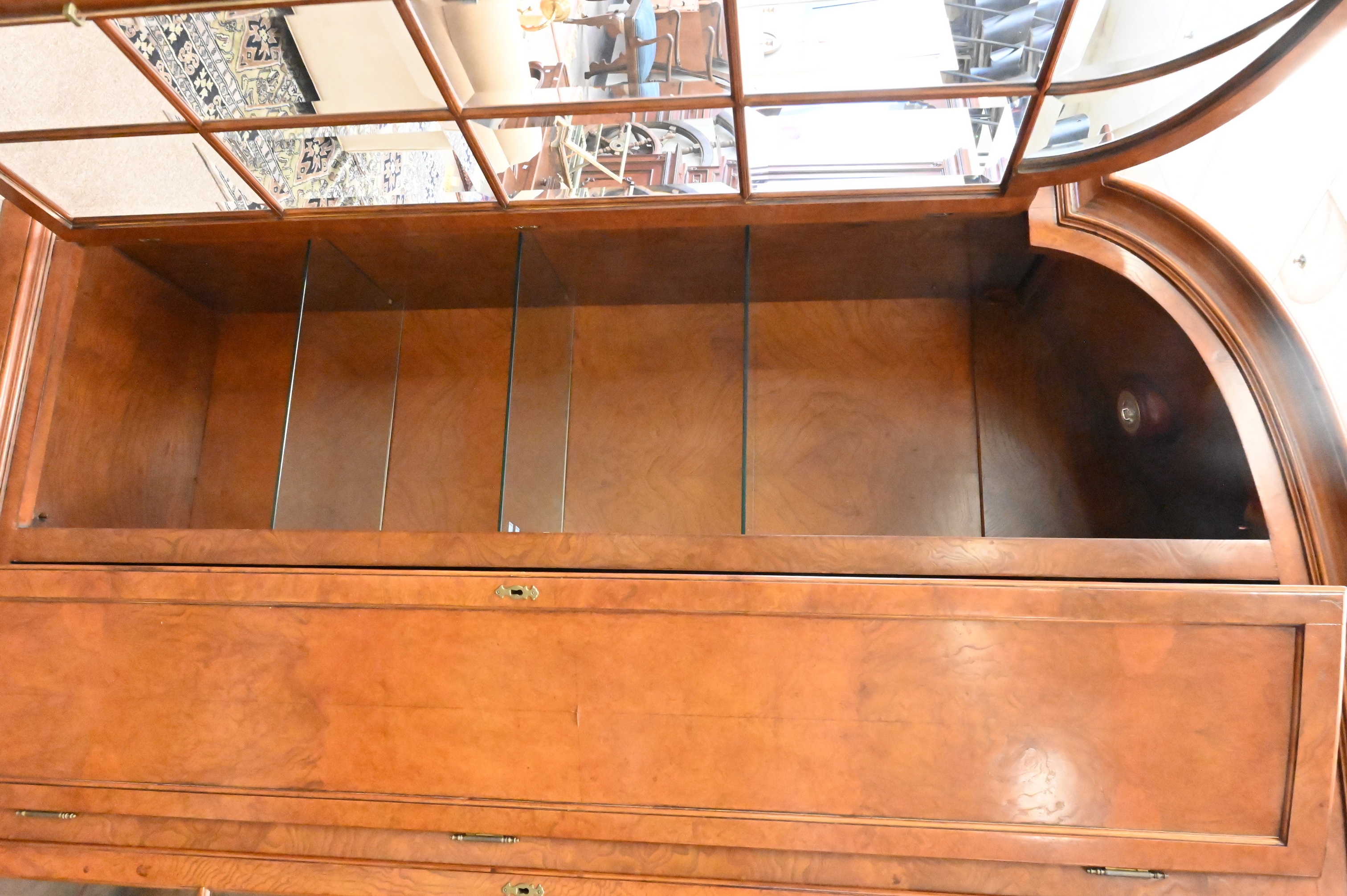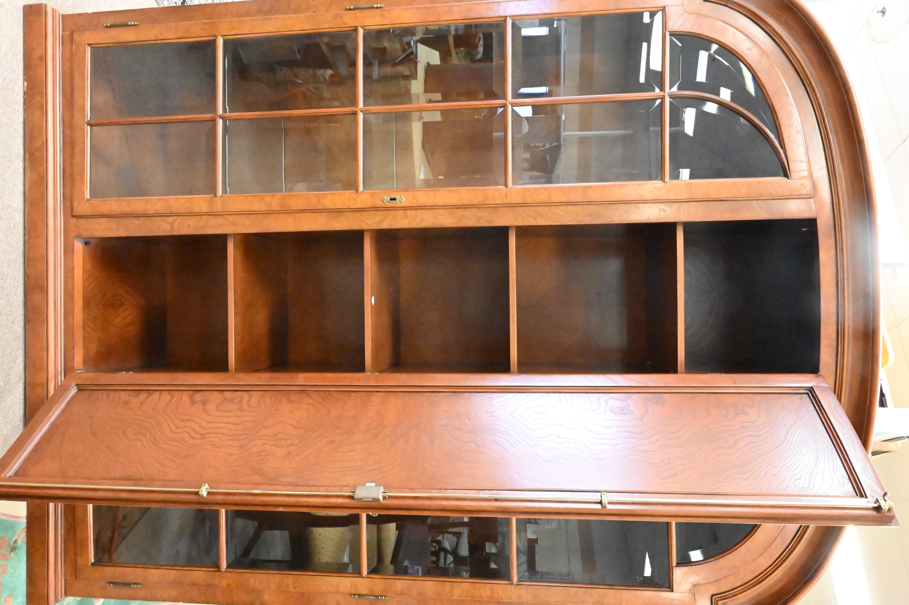 two doors having bevel glass panels flanking center storage door with interior shelves
