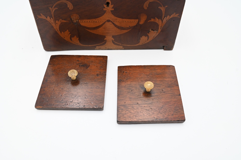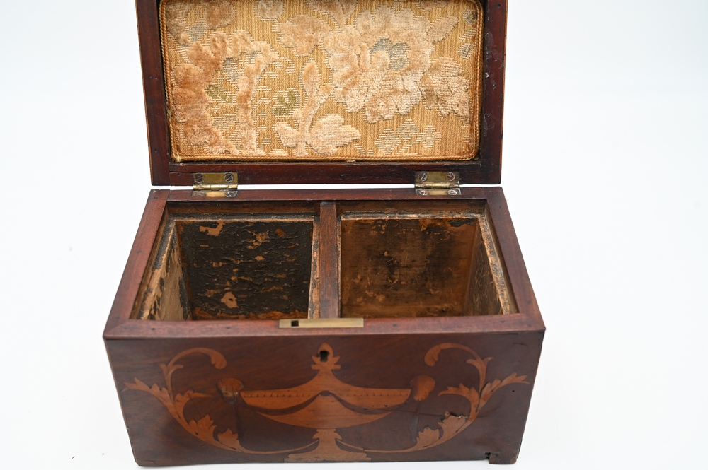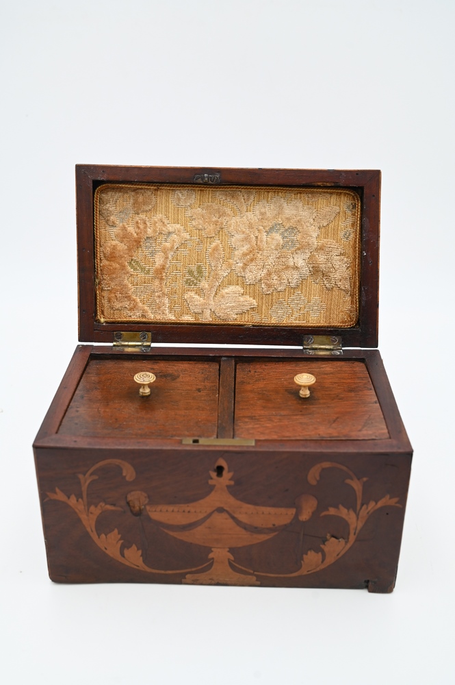 Lot 114: Mahogany Tea Box, having two interior cover, inlaid urn and scroll front, height 5 1/4 inches, length 8 3/4 inches. Provenance: Estate of Wallace Bradway, New Haven, CT.