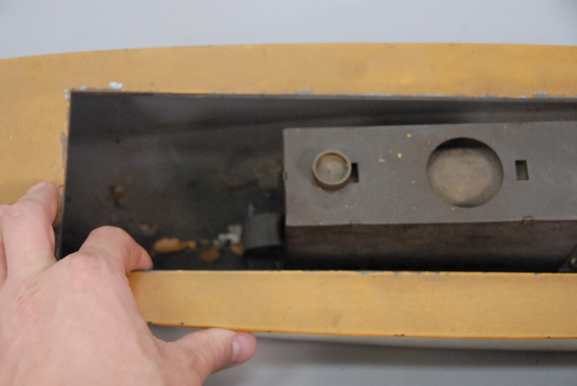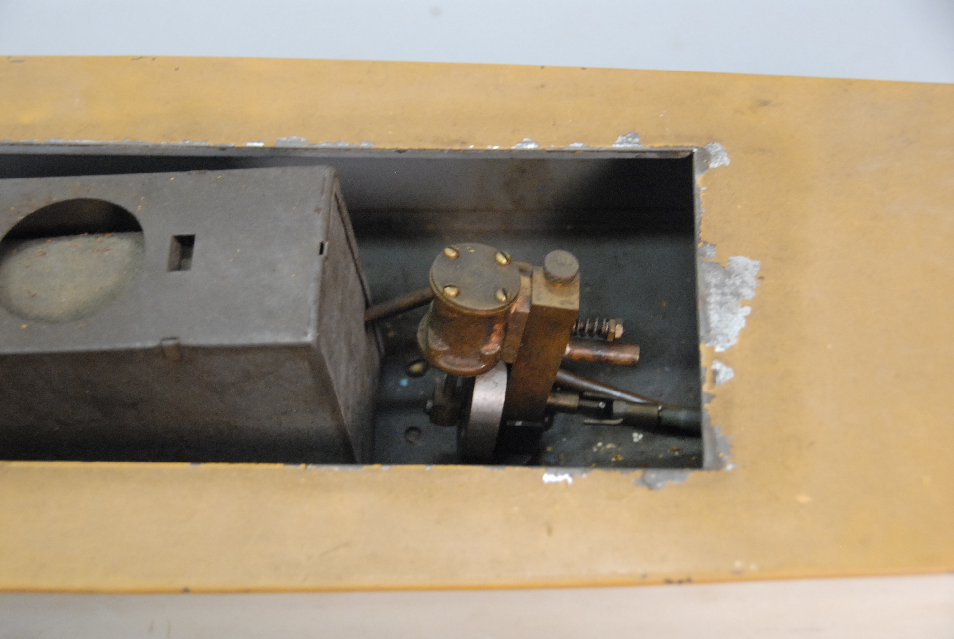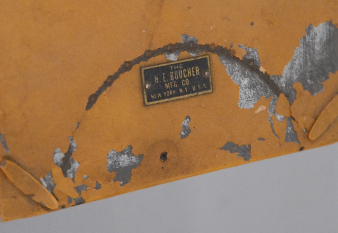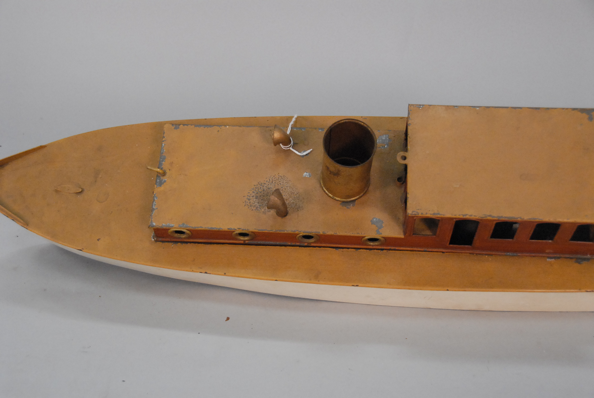 Lot 114: Metal steamboat toy with steam engine with original paint, H. E. Boucher Mfg Co, New York, N.Y. U.S.A. missing rudder. lg. 28in.