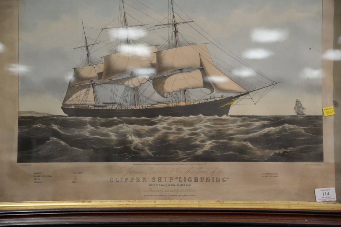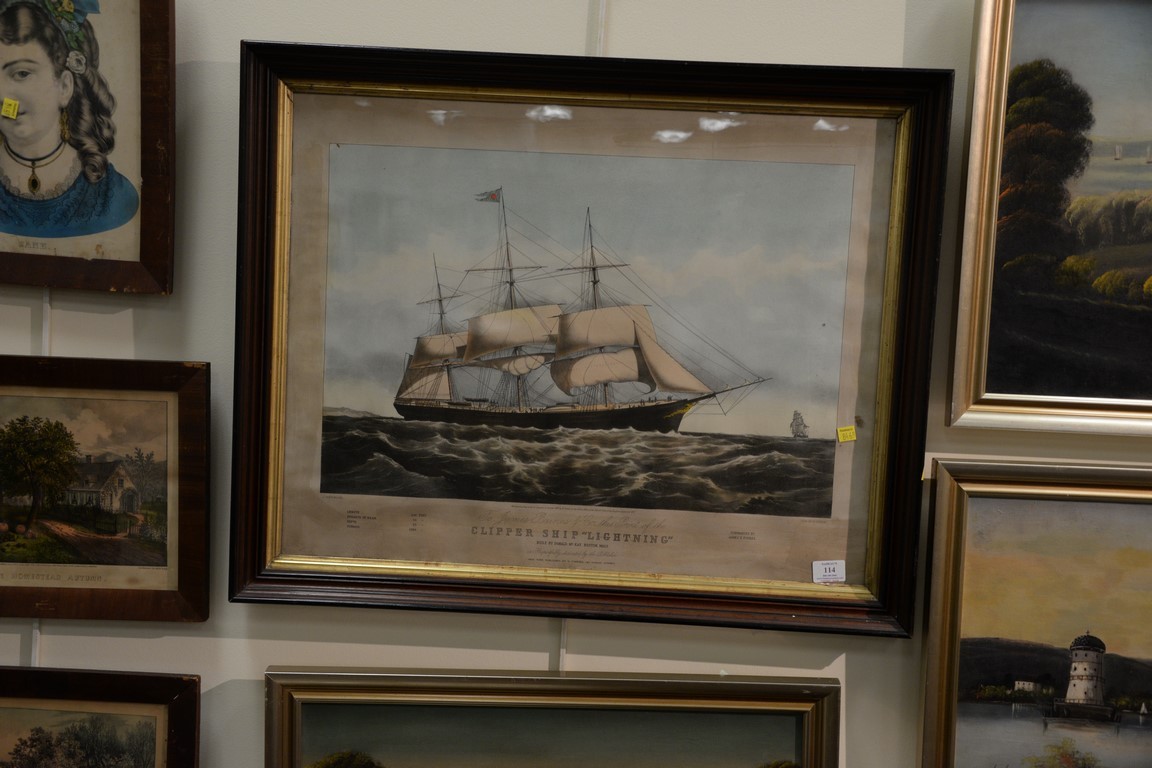 Lot 114: Nathaniel Currier, large folio hand colored lithograph, Clipper Ship Lightning, image size 16 1/2 x 24 Provenance: Estate of Art…