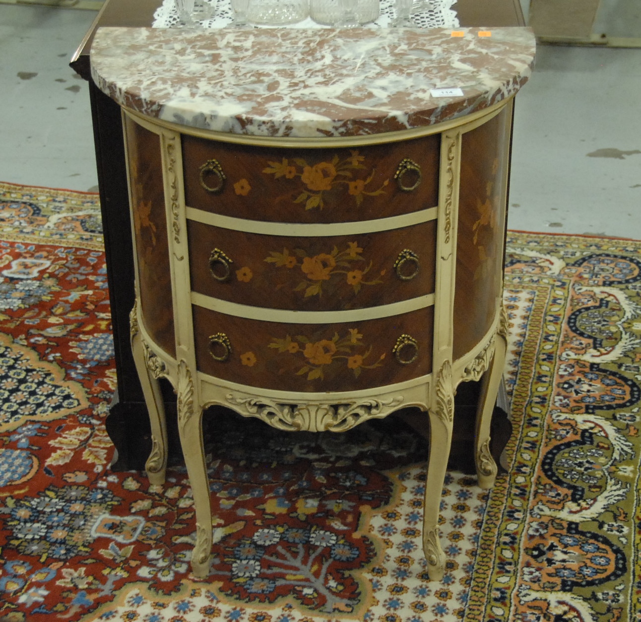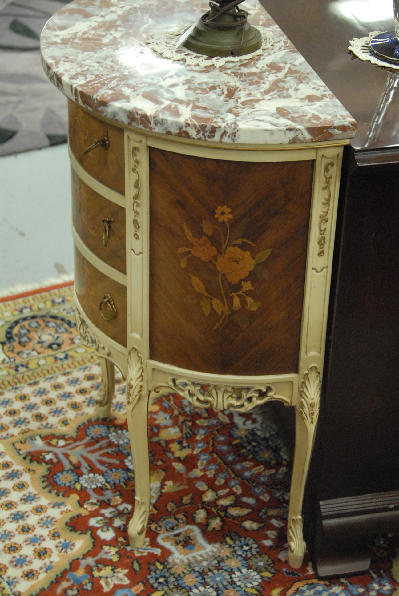Pair Louis XV style commodes with marble tops and inlaid flowers.