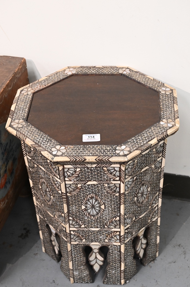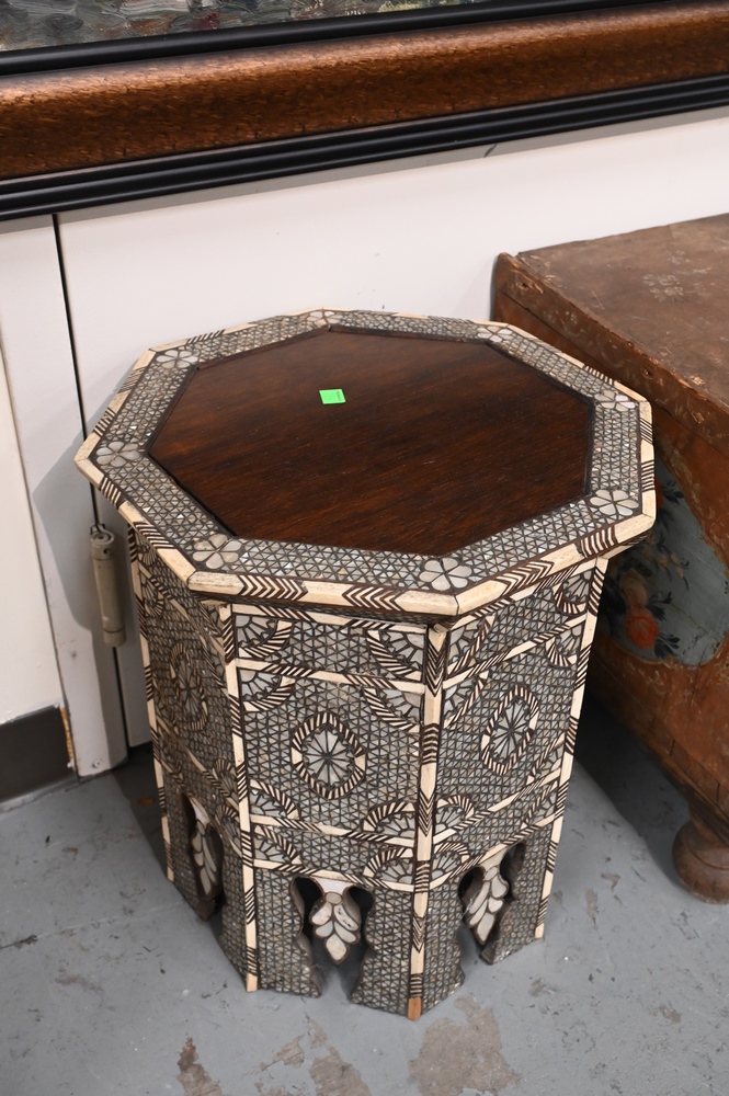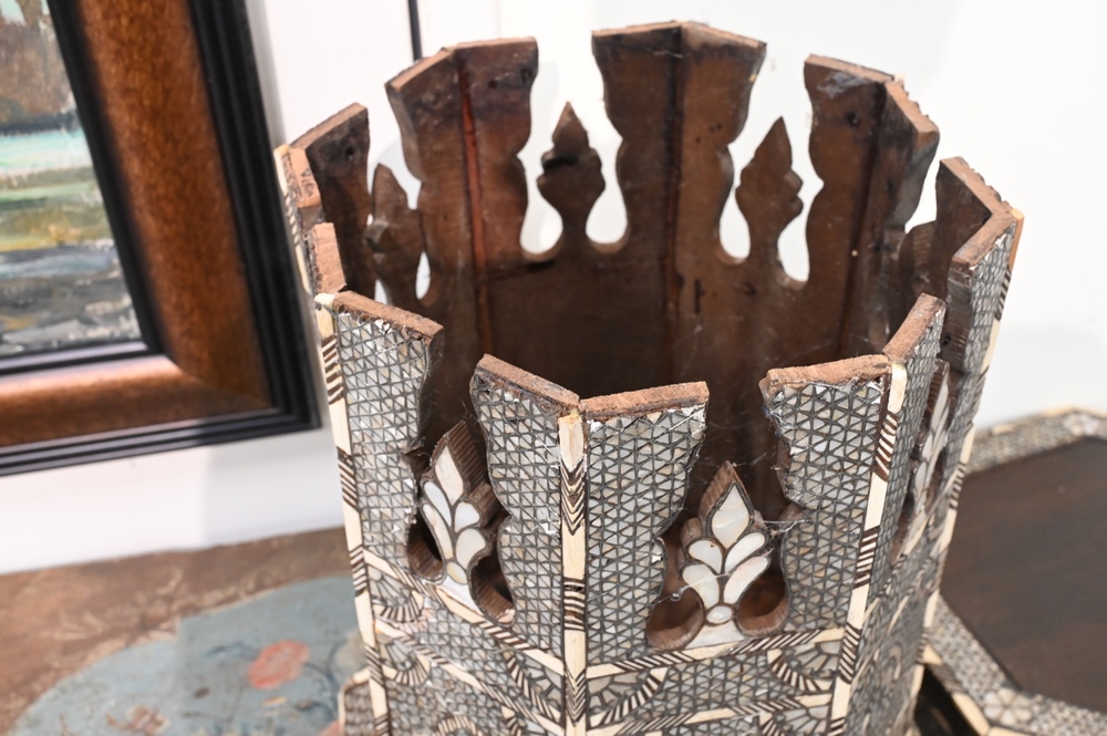 Lot 114: Pair of Bone and Mother of Pearl Inlaid Taborets, height 18 inches, diameter 15 1/2 inches.
