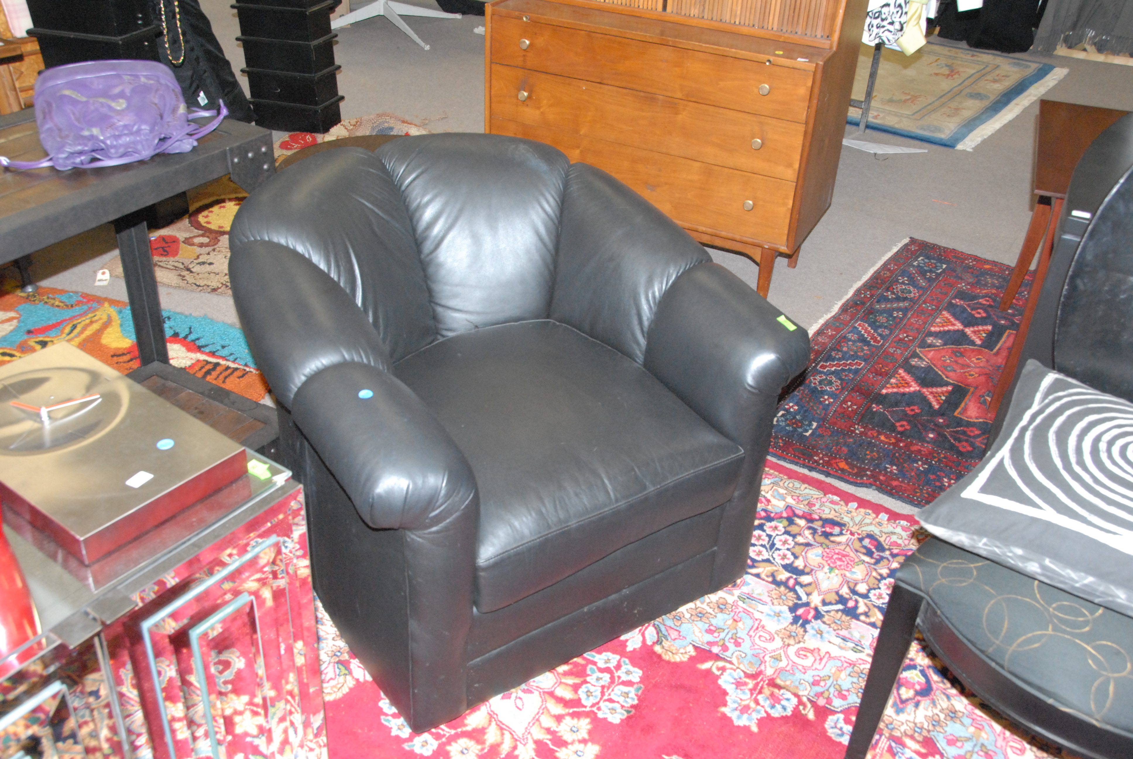 Pair of leather upholstered swivel chairs by Leather Craft in charcoal colored leather.