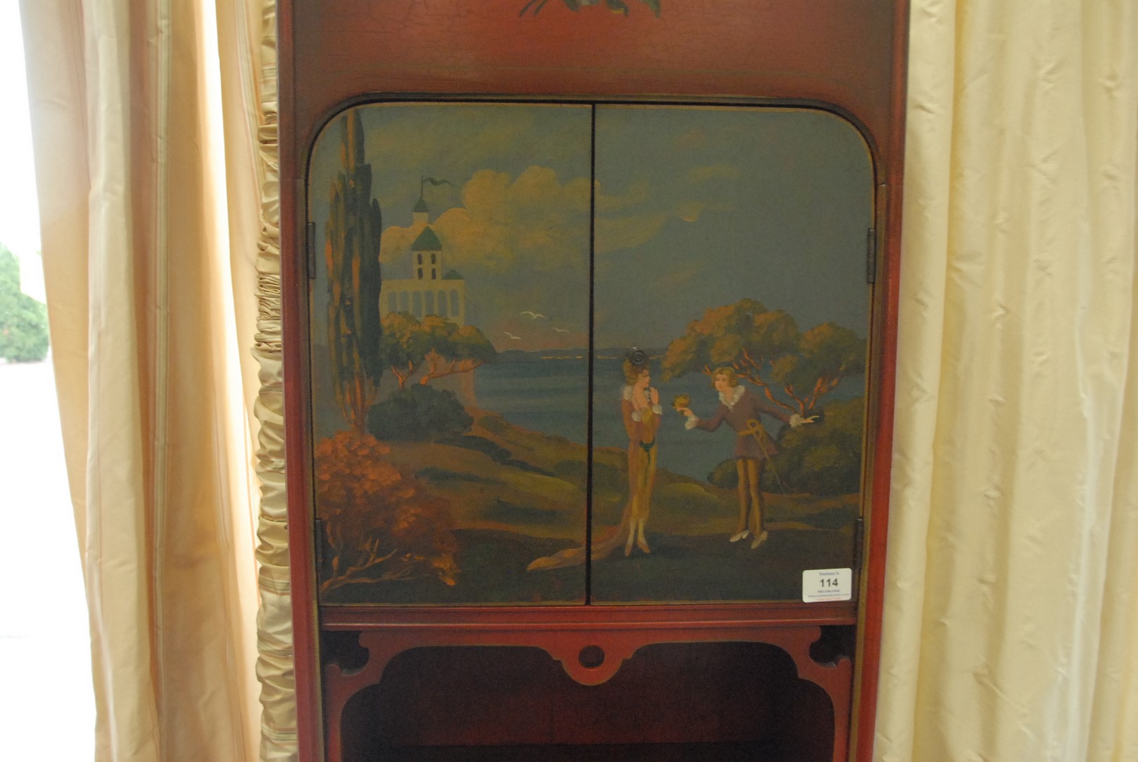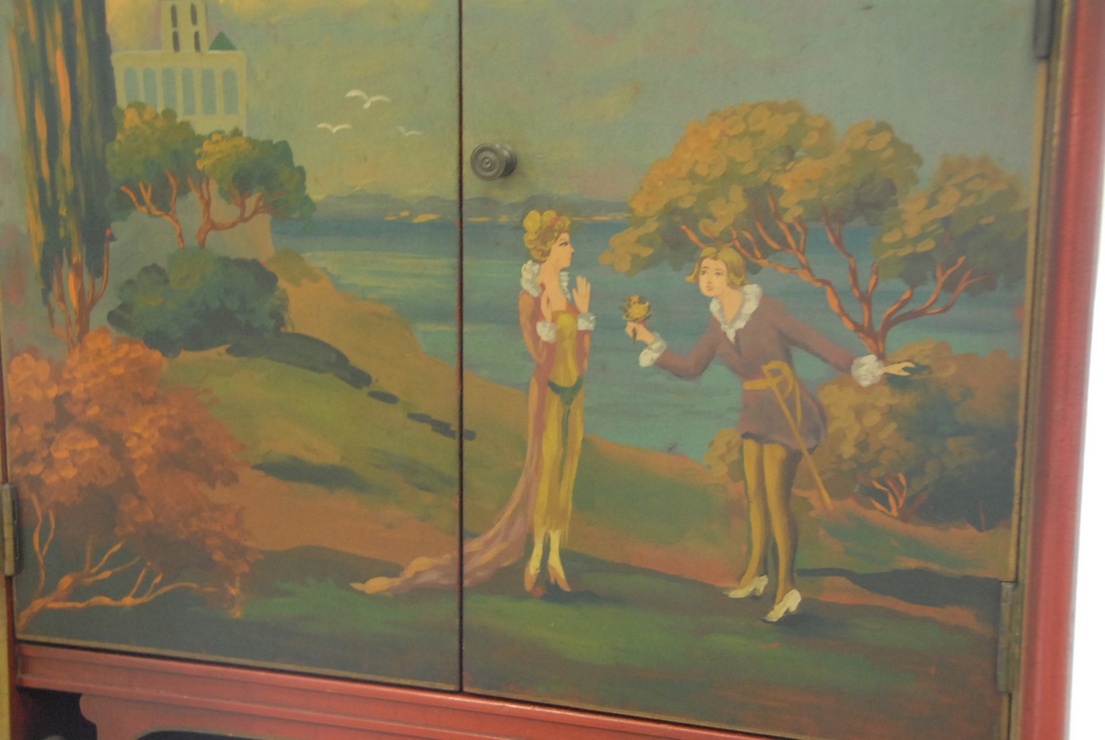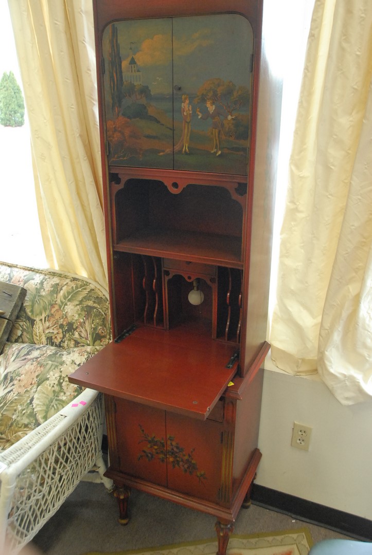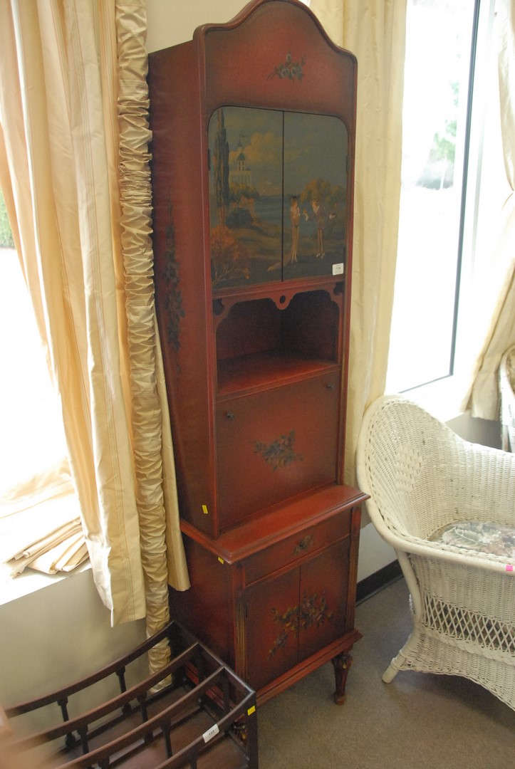 Pair of narrow, paint decorated cabinets. ht. 77 in. wd. 19 1/2 in.