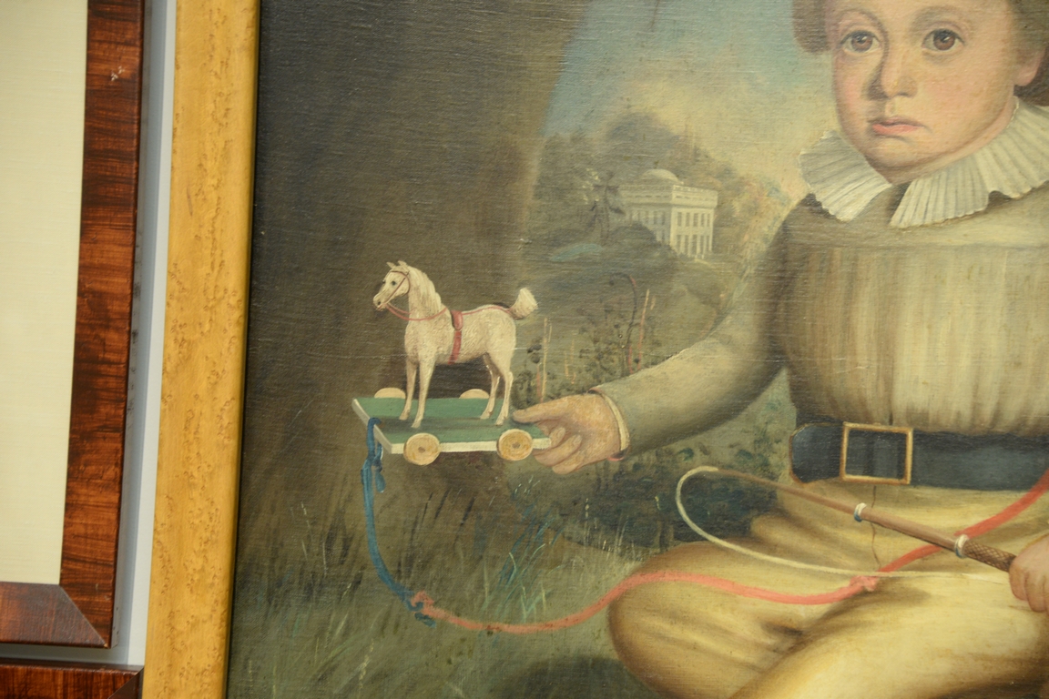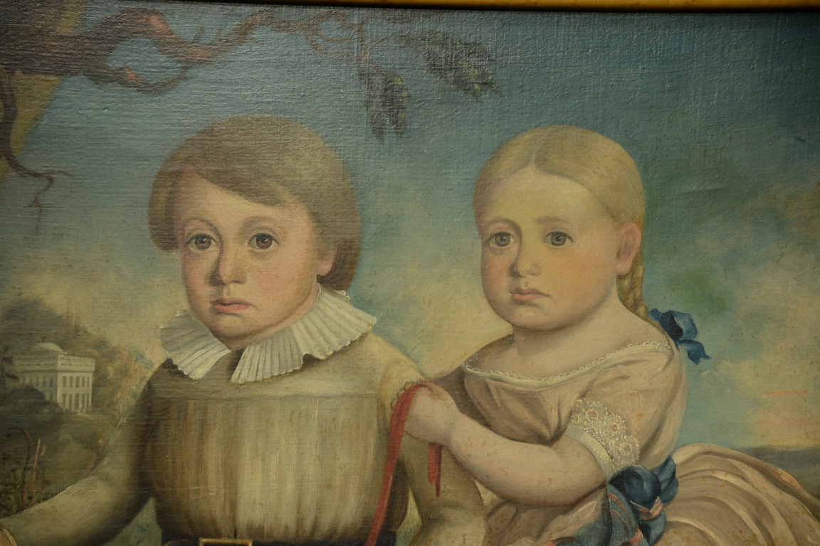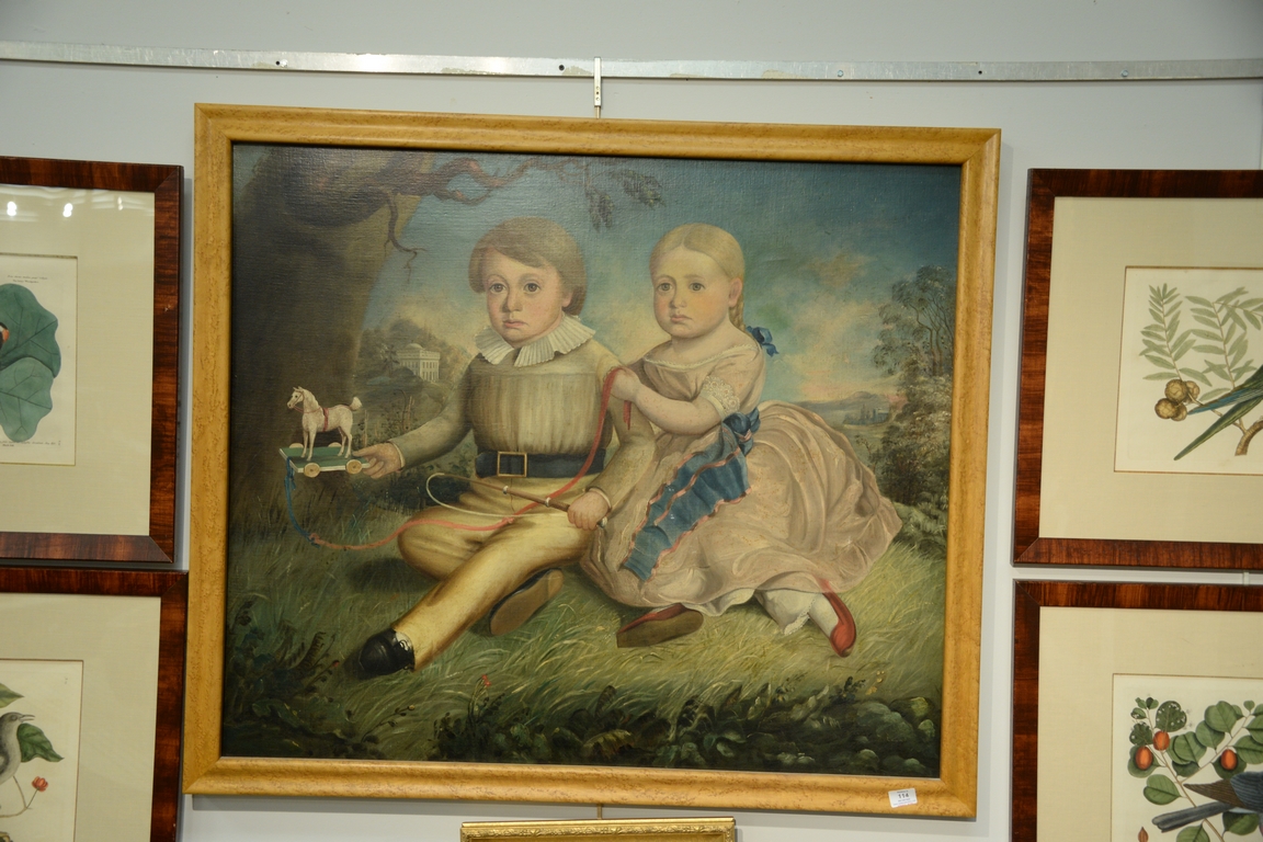 Lot 114: Primitive oil on canvas of two children, boy and girl, boy holding horse pull toy, middle 19th century. relined 36 x 42
