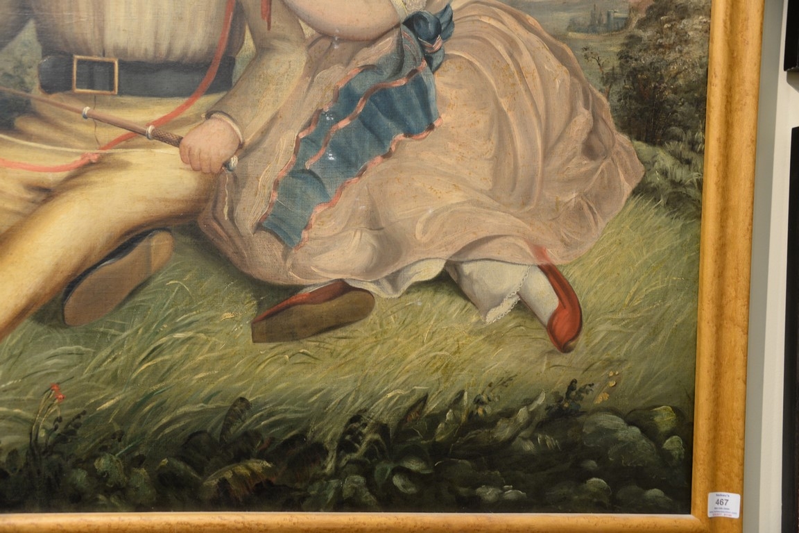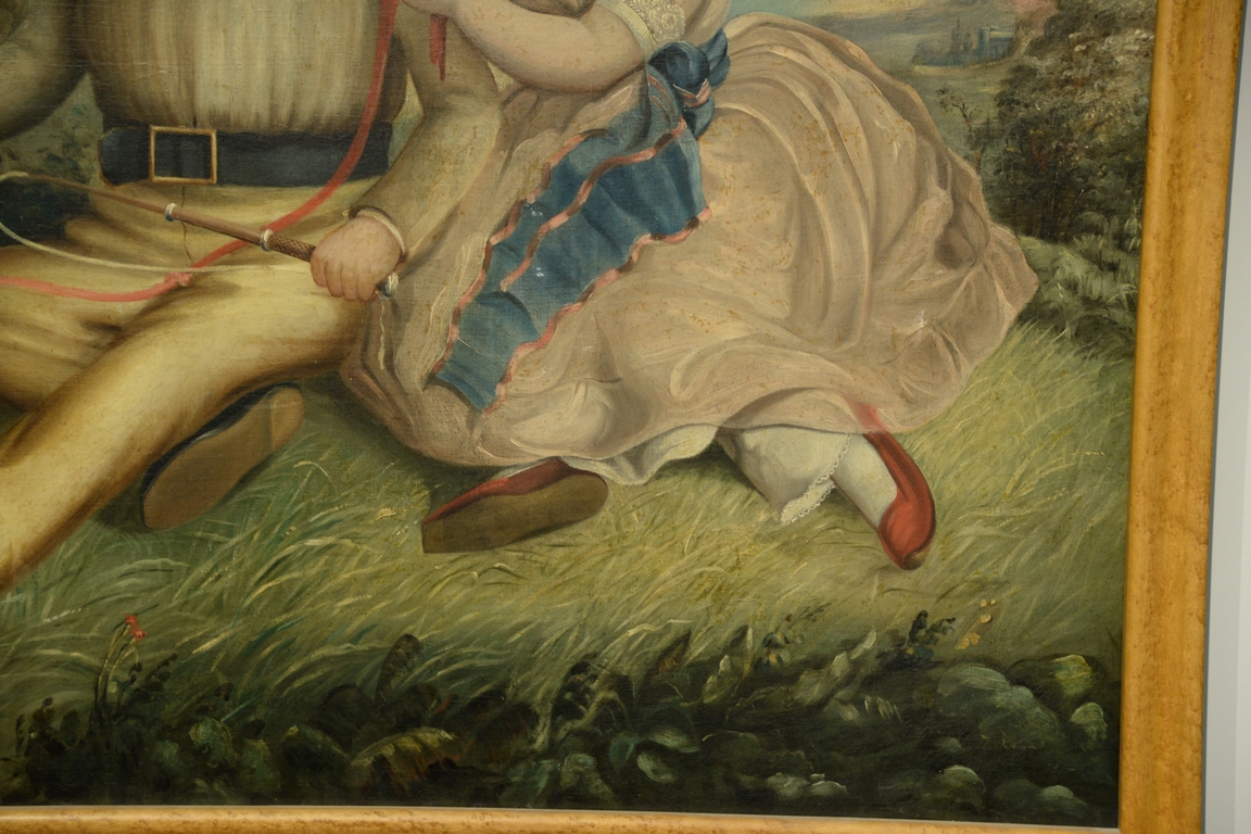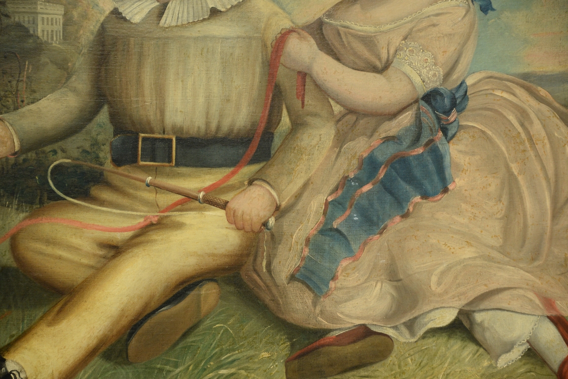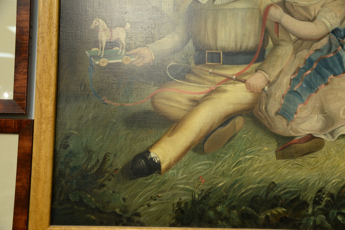 Lot 114: Primitive oil on canvas of two children, boy and girl, boy holding horse pull toy, middle 19th century. relined 36 x 42