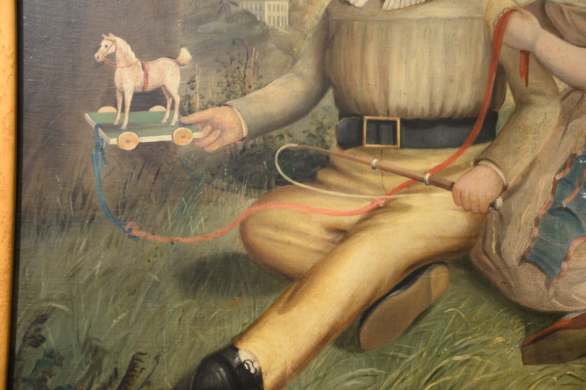 Primitive oil on canvas of two children, boy and girl, boy holding horse pull toy, middle 19th century.