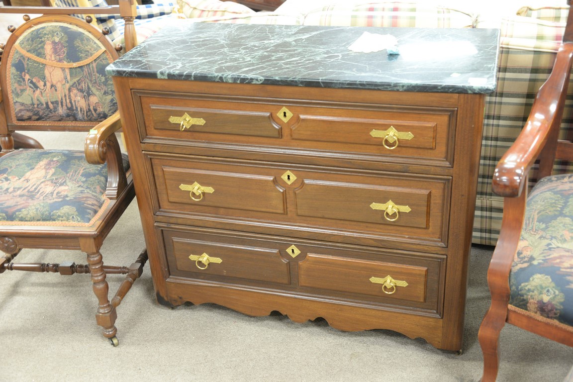 Refinished Victorian three drawer chest with granite top. ht. 33in., wd. 39in., dp. 17in.