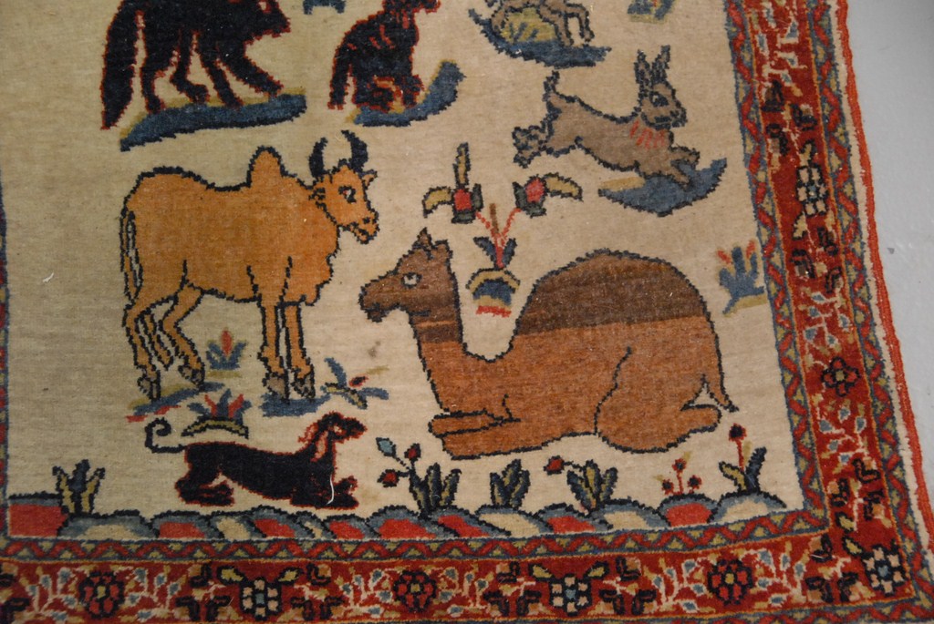 Small Kirman mat with animals, 19 x 20.