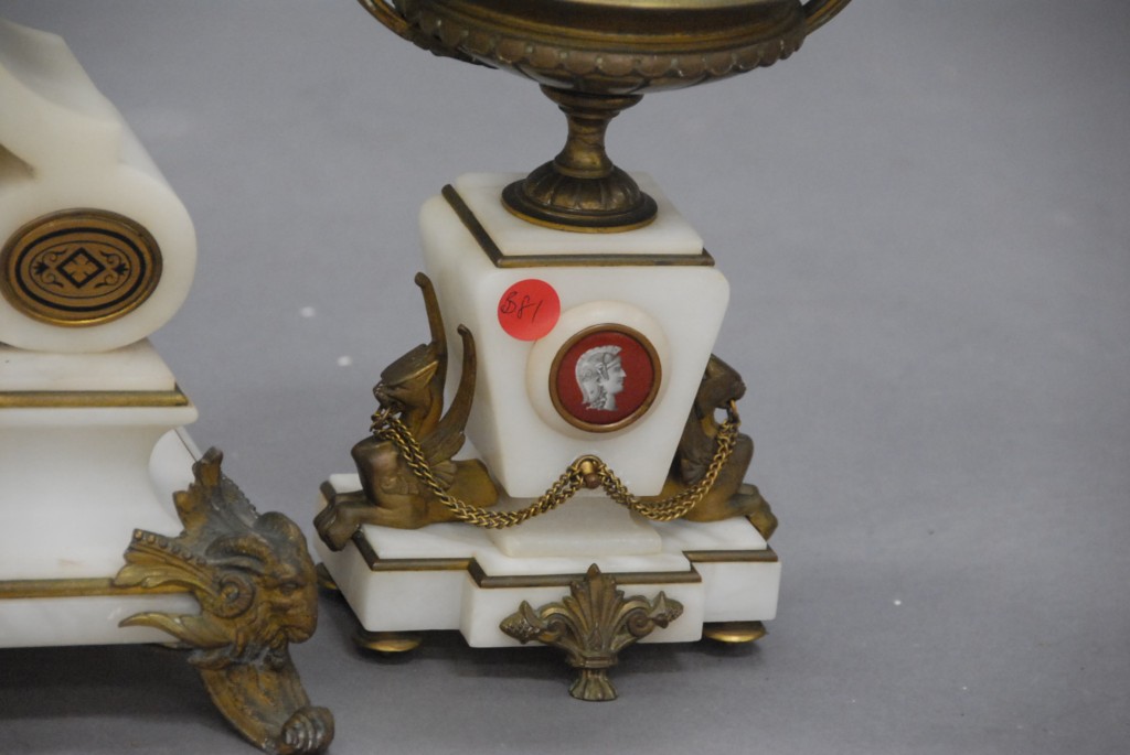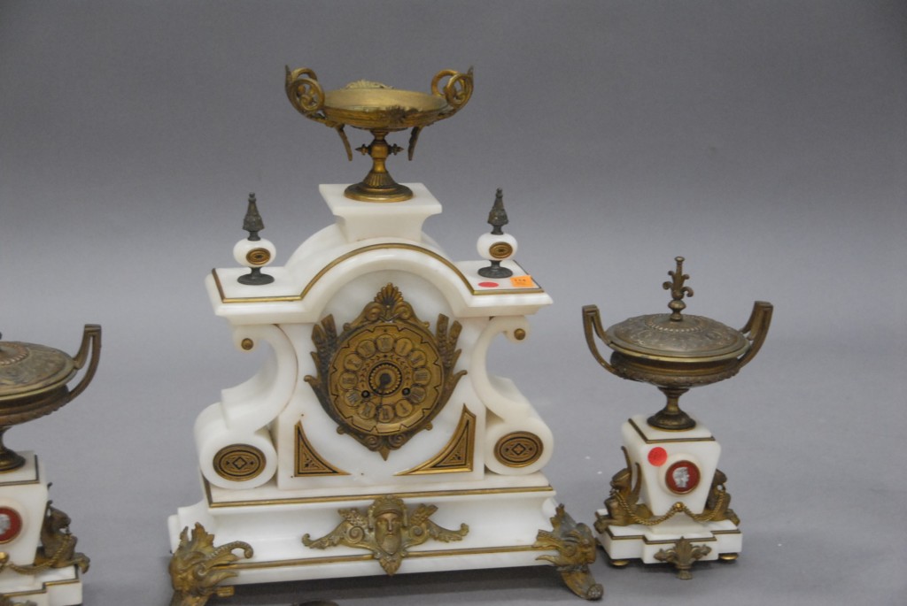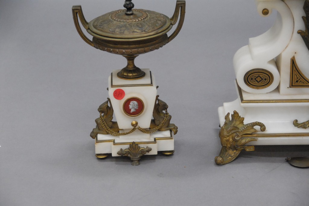 Three piece alabaster / marble clock set with two urns and some enameling.