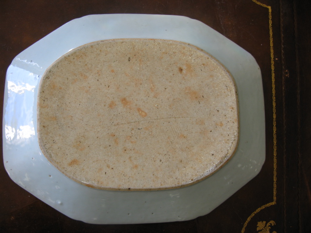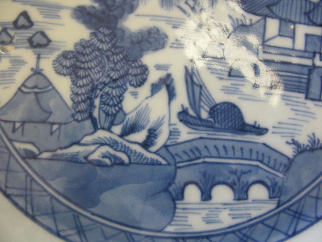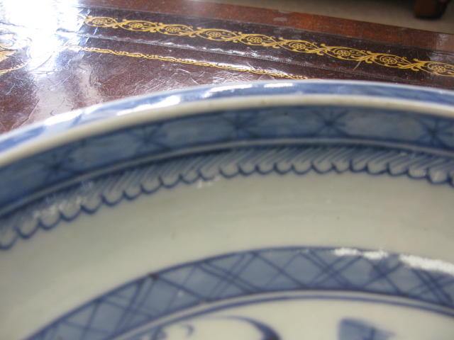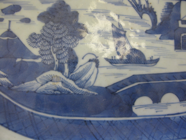 Two Canton pieces, round shallow dish and platter, dish has chip and crack
