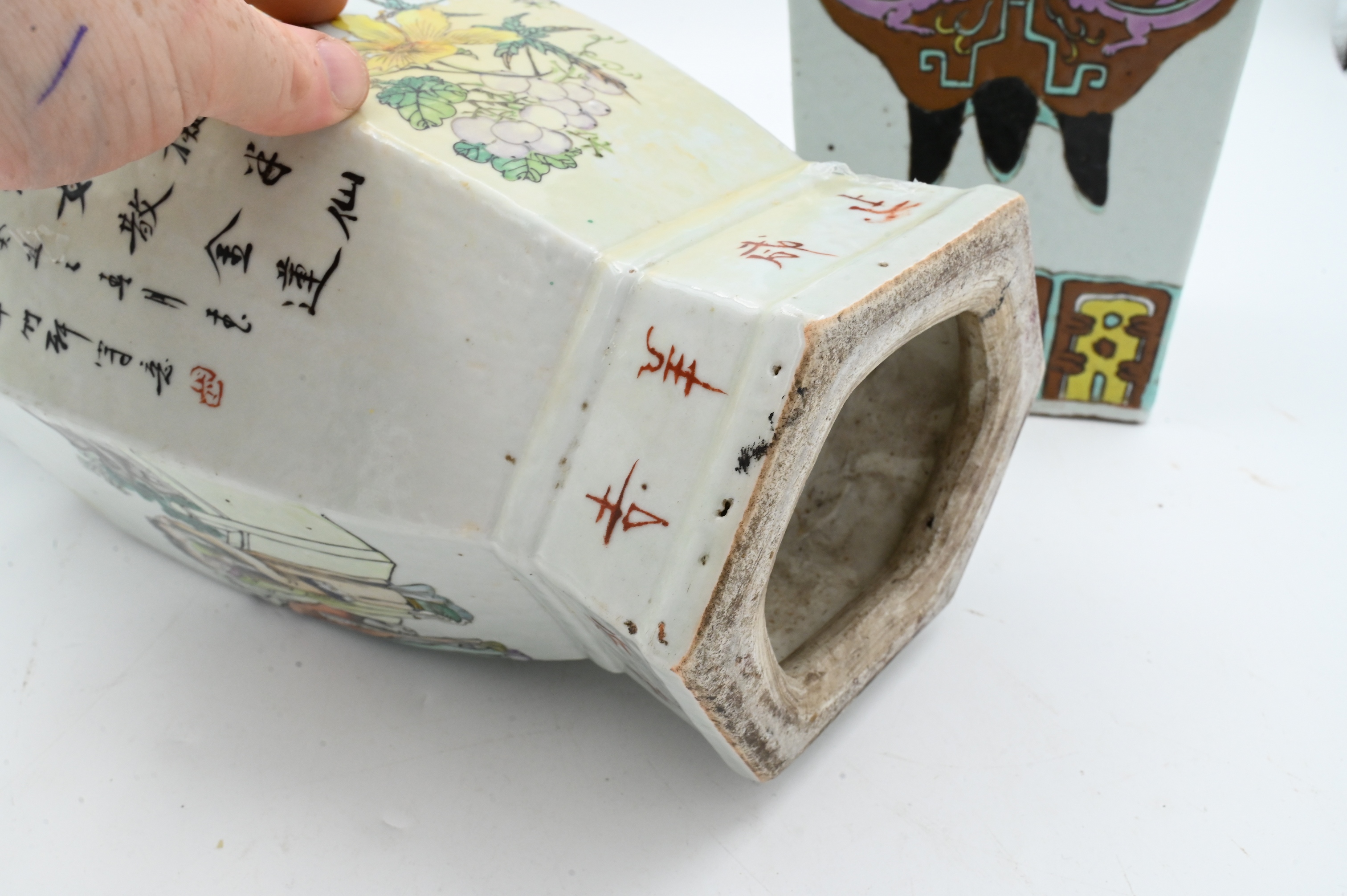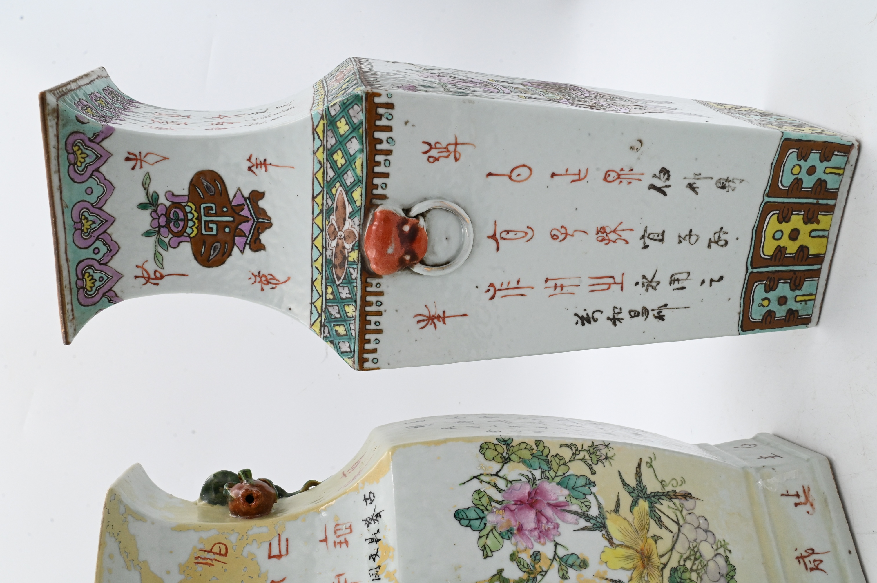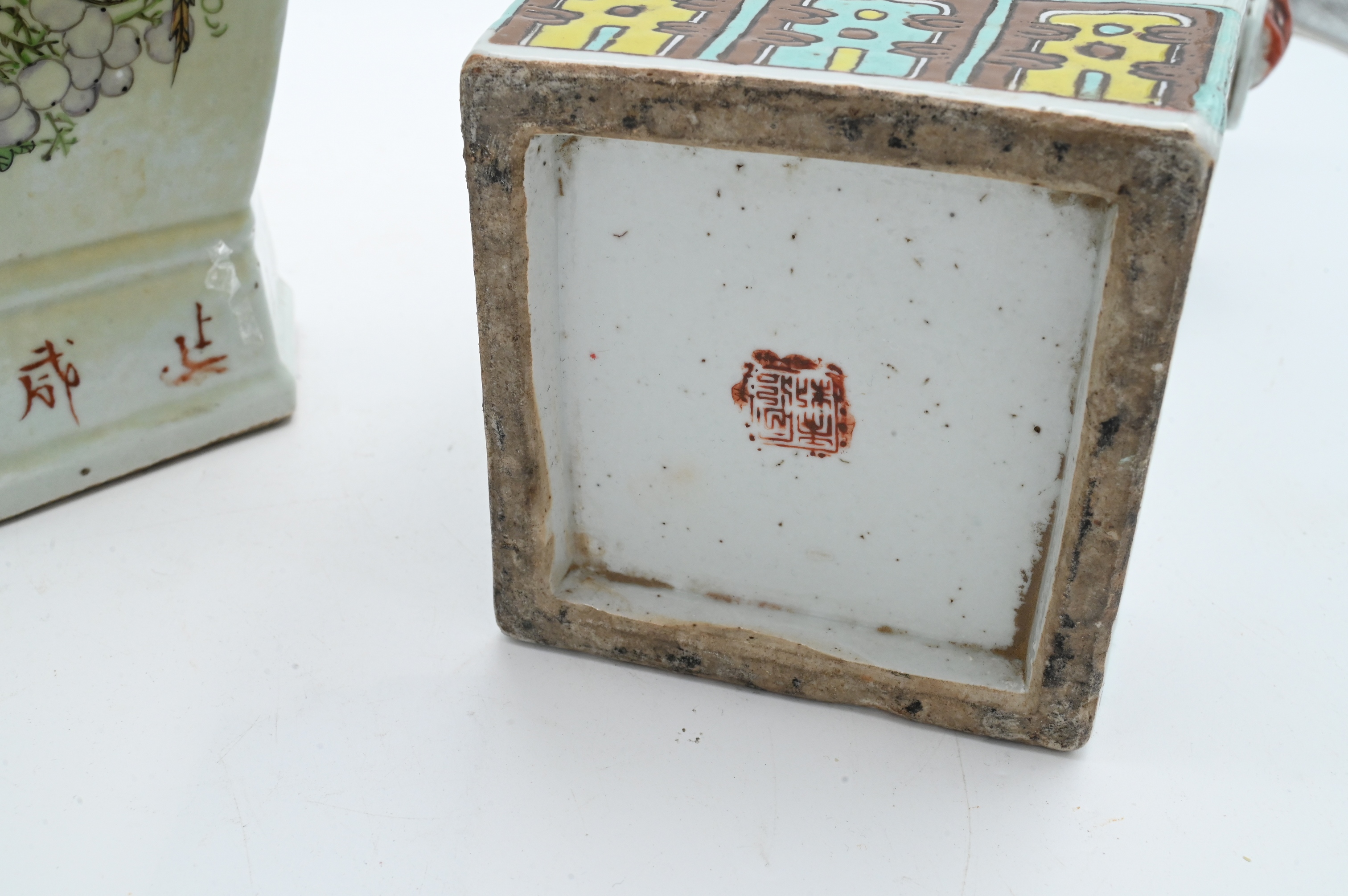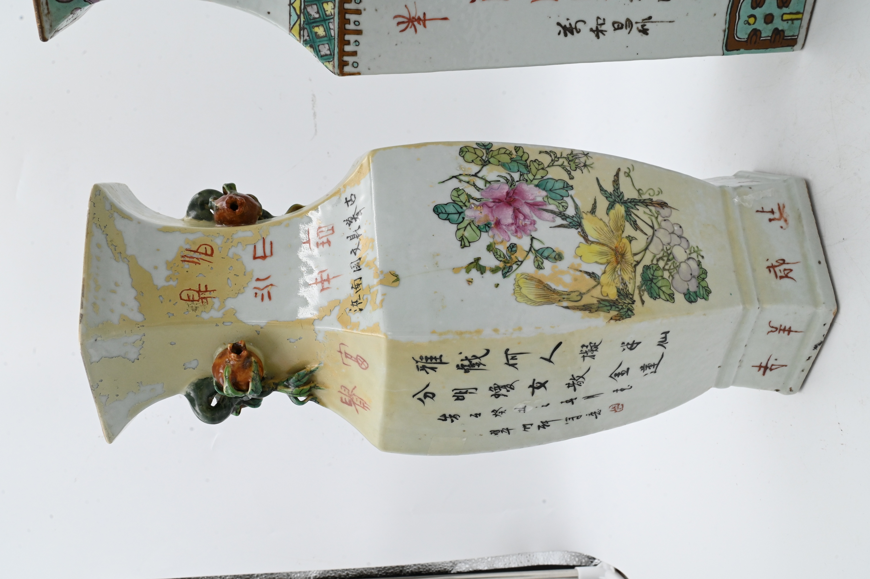 to include one square form vase having double foo dog knocker handles with enameled ritual vessel motif, the other having raised rose form handles with flower and Geisha motif