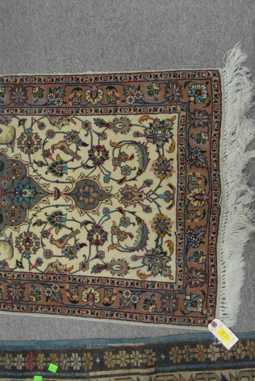Two piece lot small Oriental rug, 2′ x 4’3 and needlepoint rug 3′ x 5′.