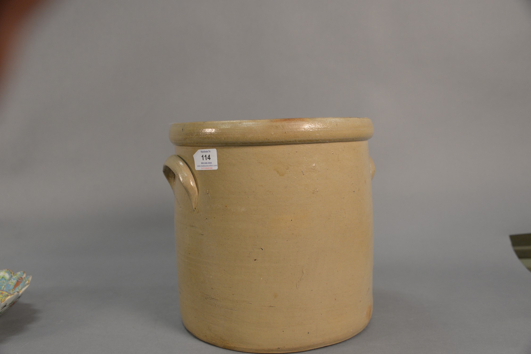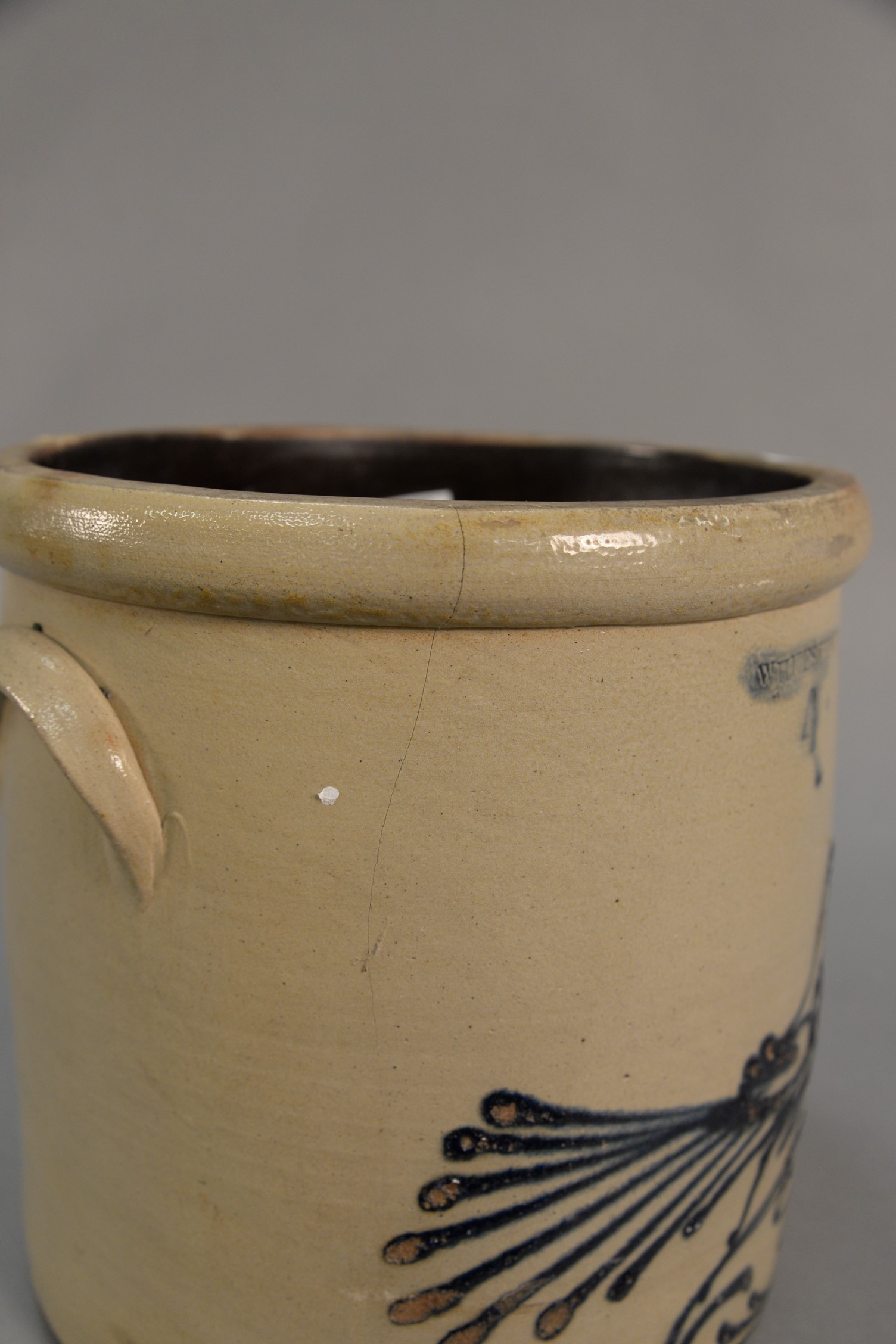 Lot 114: Whites Utica four gallon stoneware crock with cobalt blue bird and two handles crack. ht. 11 1/2 in.