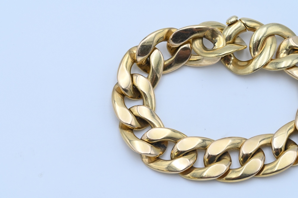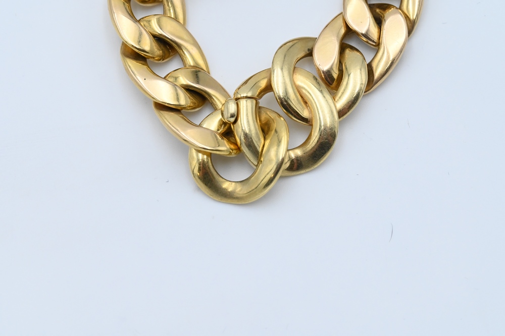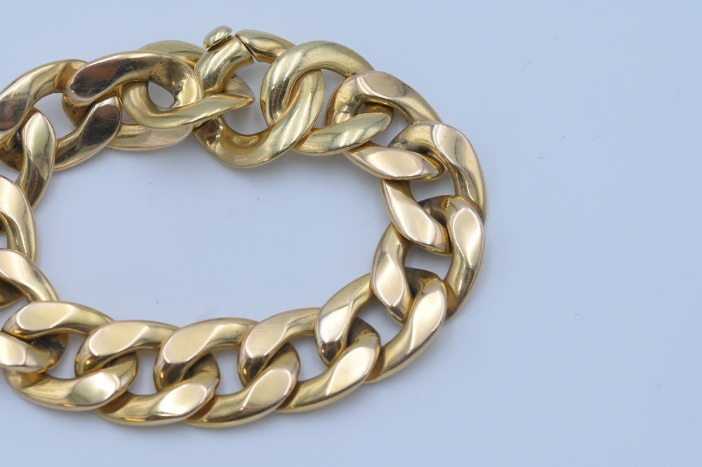 Lot 115: 14 Karat Gold Large Link Bracelet, length 8 inches, 43 grams.