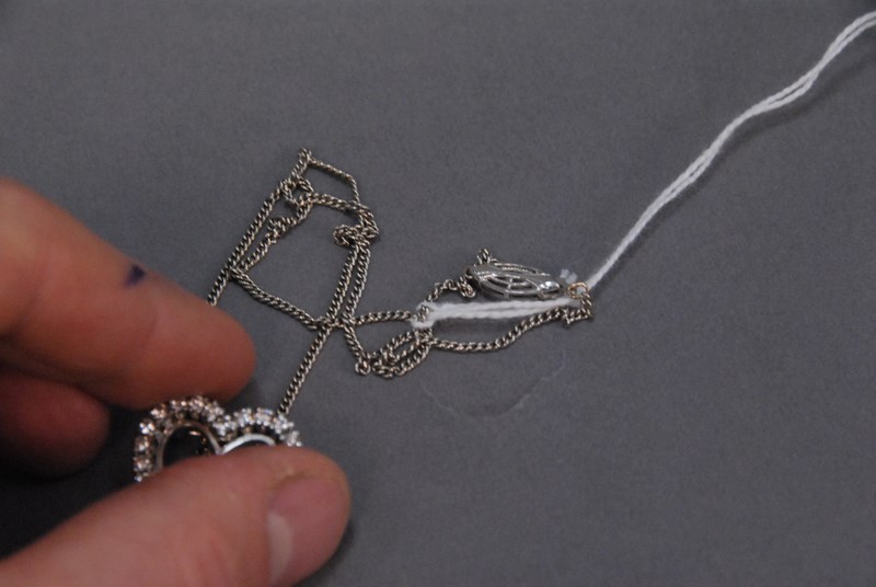 14K white gold heart shaped pin set with 24 diamonds on chain.