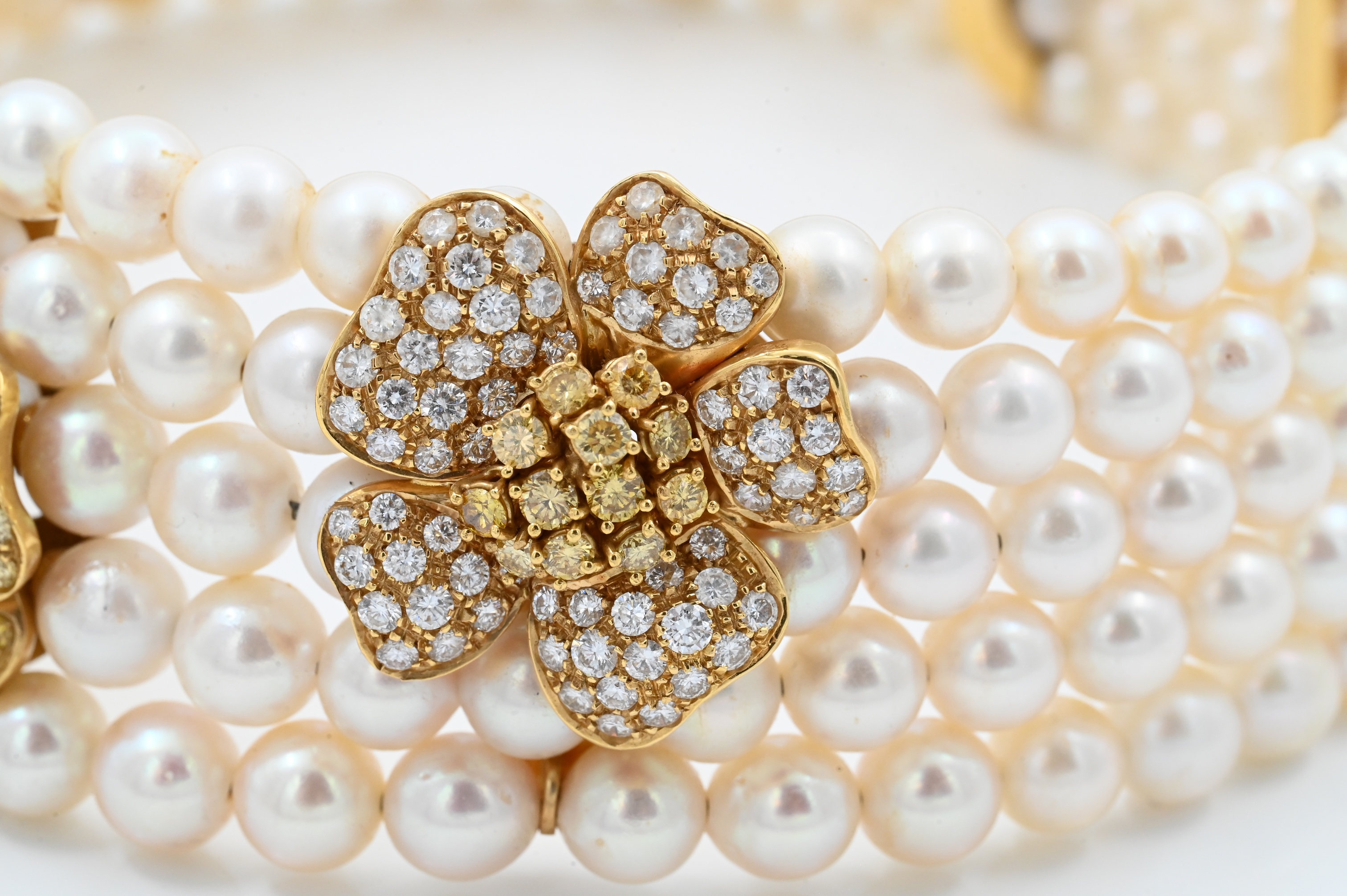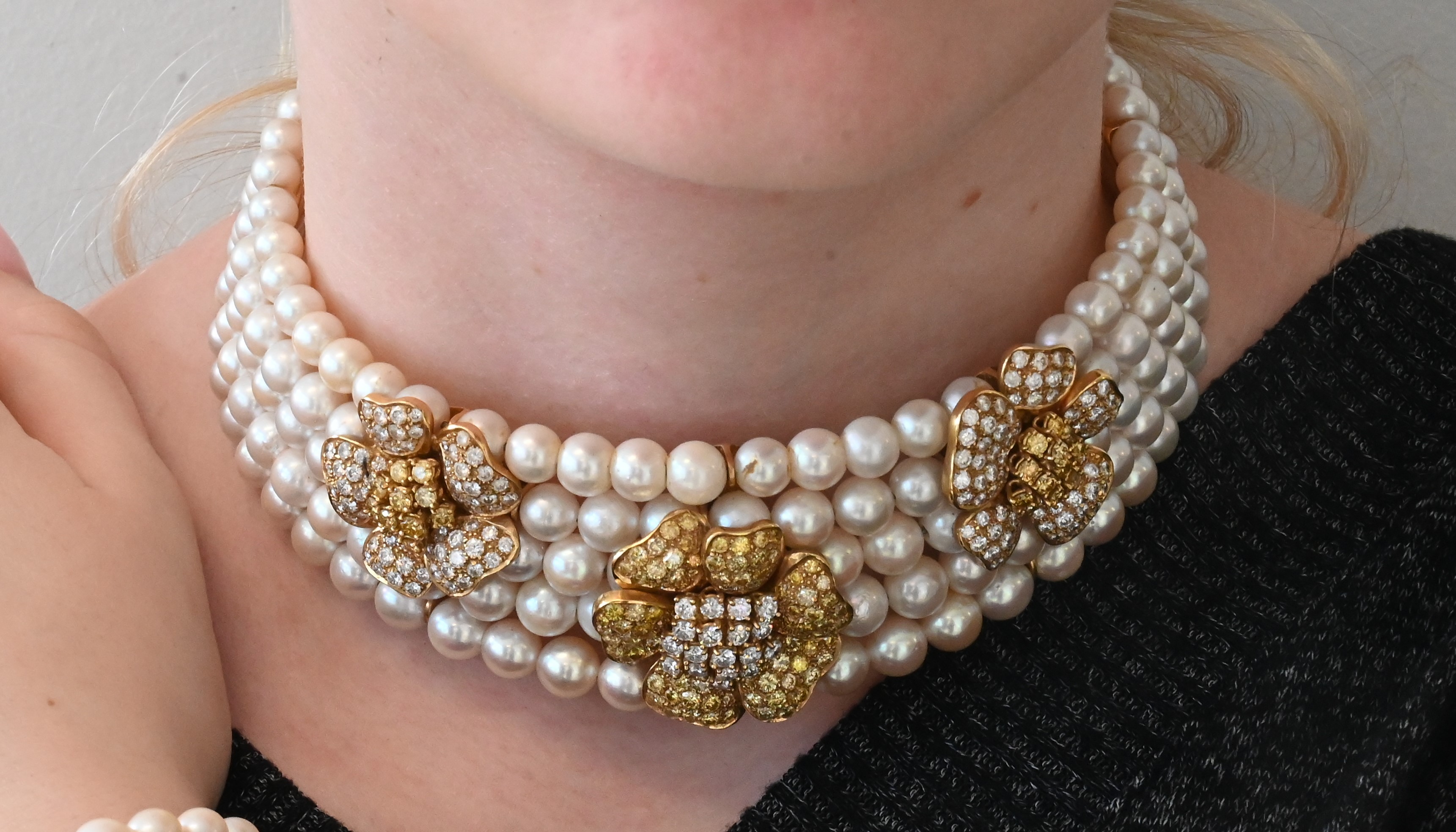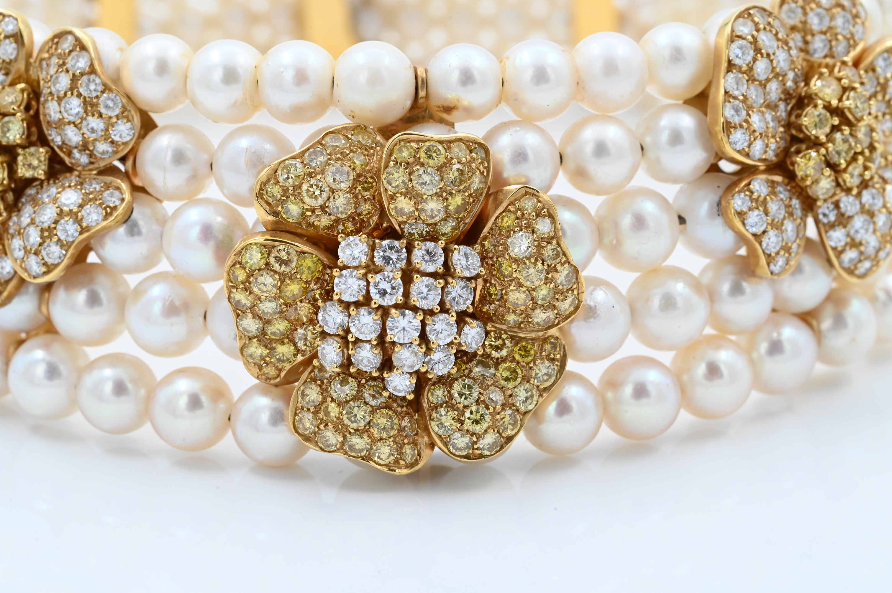 having five rows of 6 to 8.5 millimeter round pearls set with three flower form designs having 117 canary yellow diamonds approximately 8.9 carats total and 124 round diamonds approximately 9.75 carats,