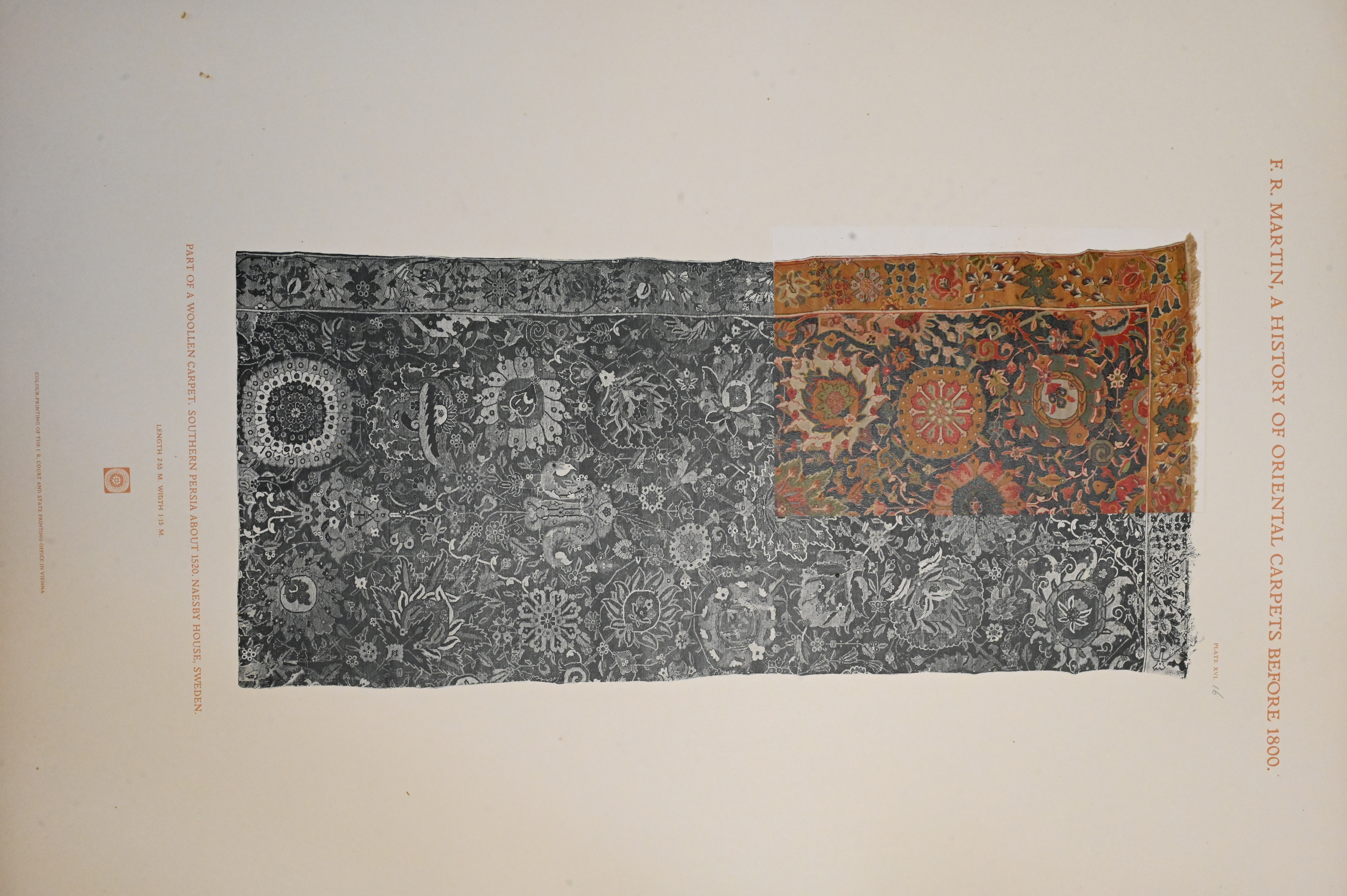 by F.R. Martin, reproduced by the Imperial Royal Austrian Court, 1908 edition of 290 copies having plates printed on paper, loose leaf, 33 plates of black and white colored carpets bound in original cloth cover