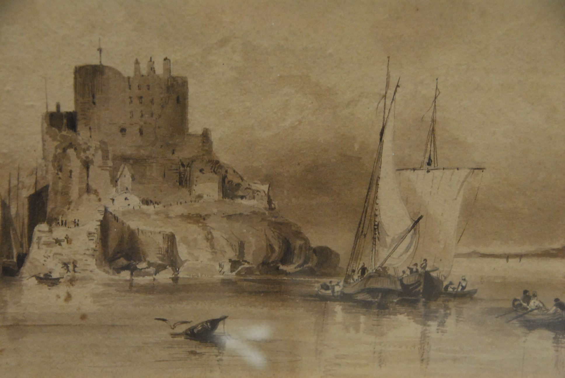 Black and white sepia landscape with castles at water’s edge, unsigned, sight size 7 x 11.