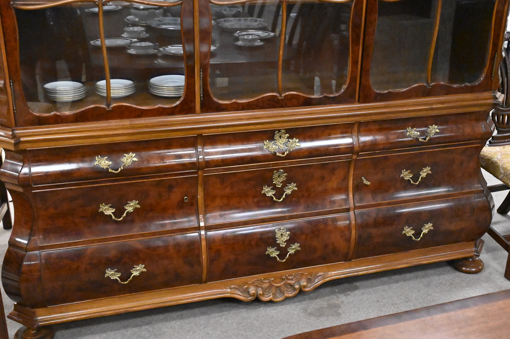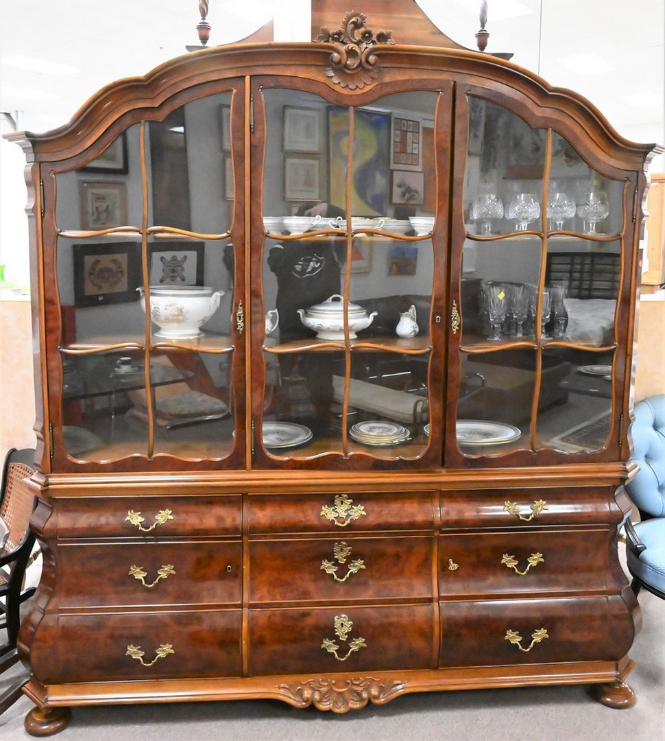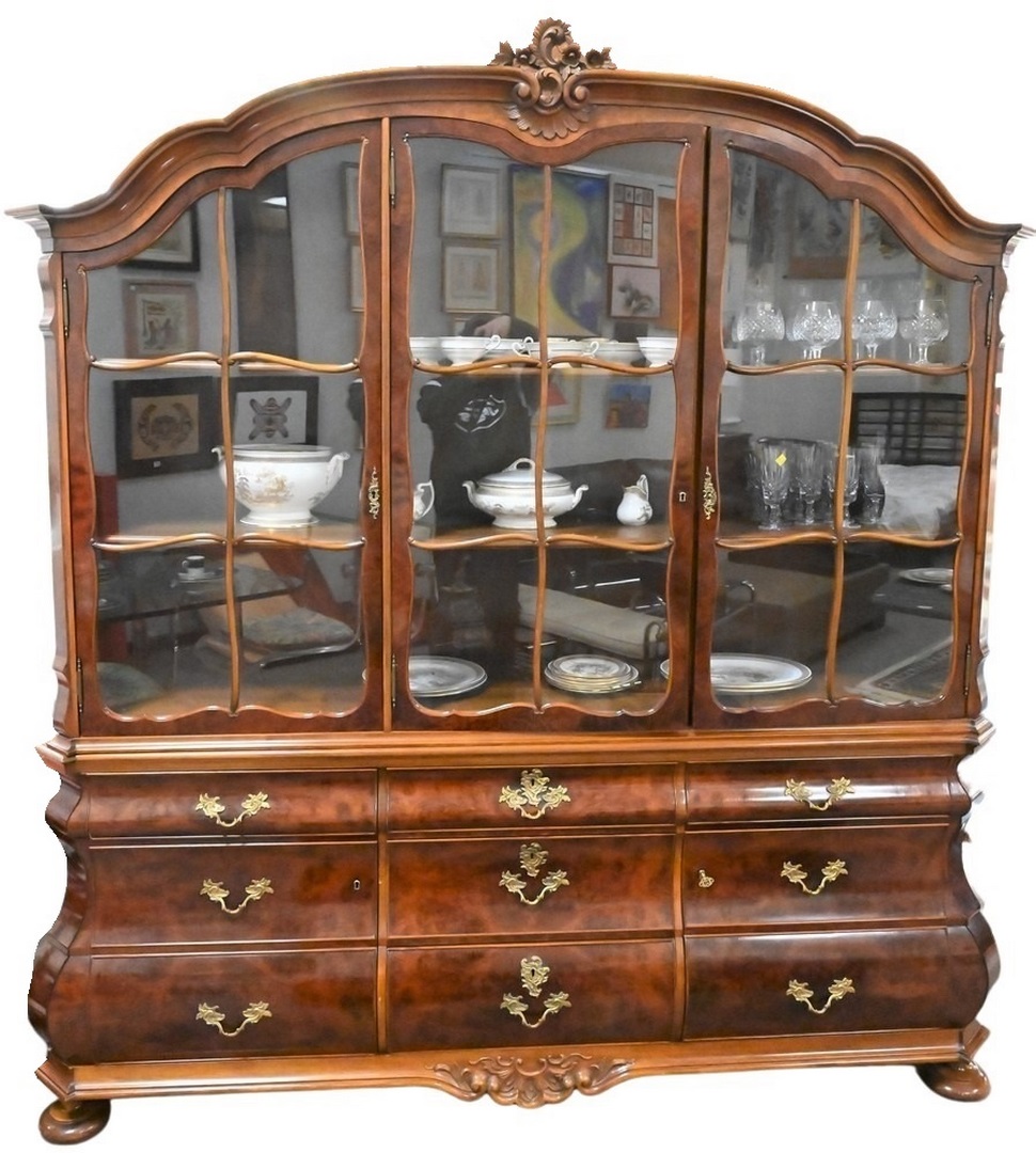 Continental Burl Walnut Breakfront, having doors and drawers, in two parts, height 84 inches, total width 80 inches.
