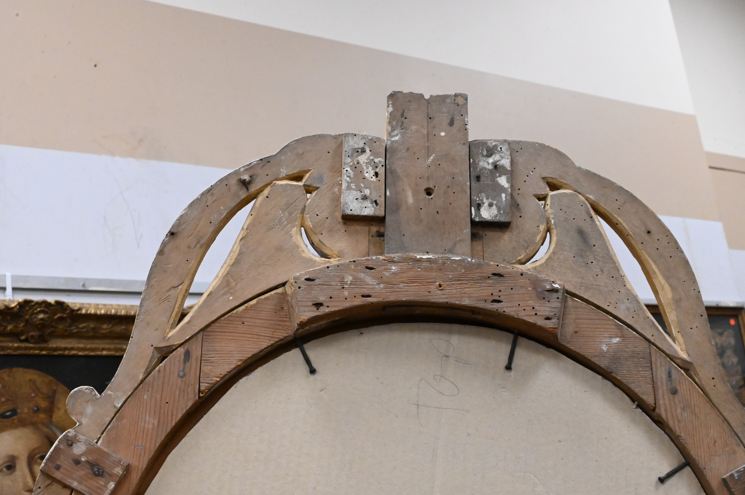 having double sunflower carved pediment flanked by scrolling “S” curves traveling down to additional openwork scrolls