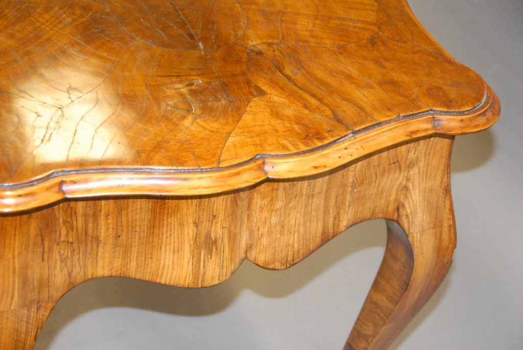 Continental style shaped table with three drawers on either side and Burlwood top.