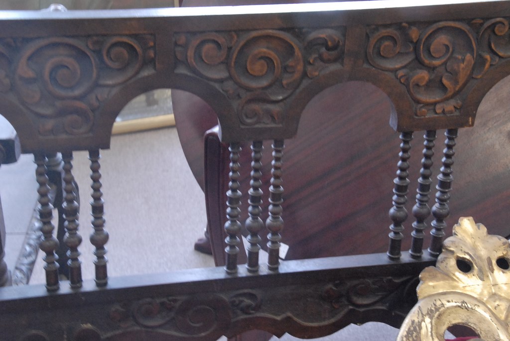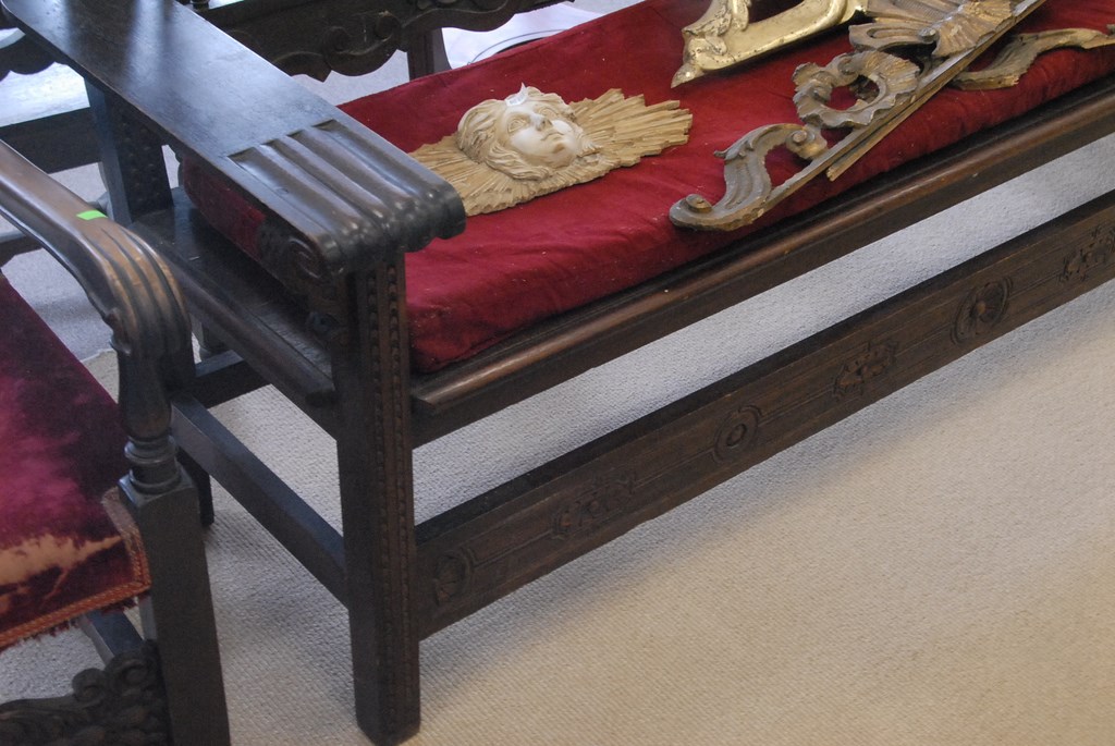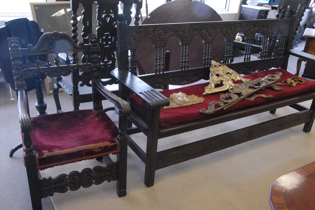 Continental style wooden bench and near matching armchair with carved back, bench lg. 81 in.