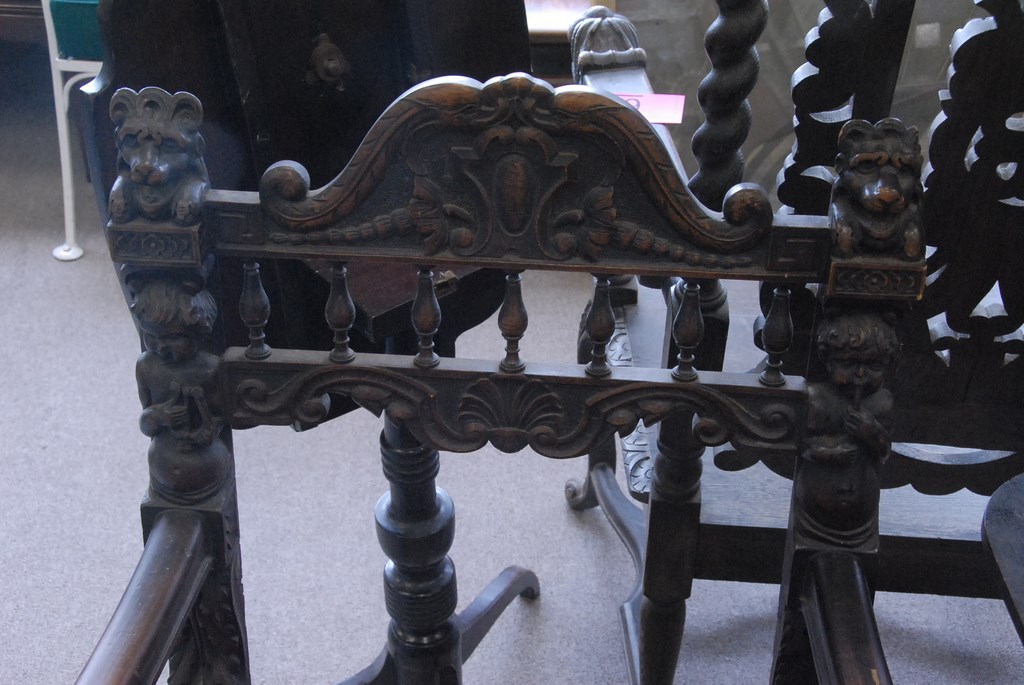 Lot 115: Continental style wooden bench and near matching armchair with carved back, bench lg. 81 in.