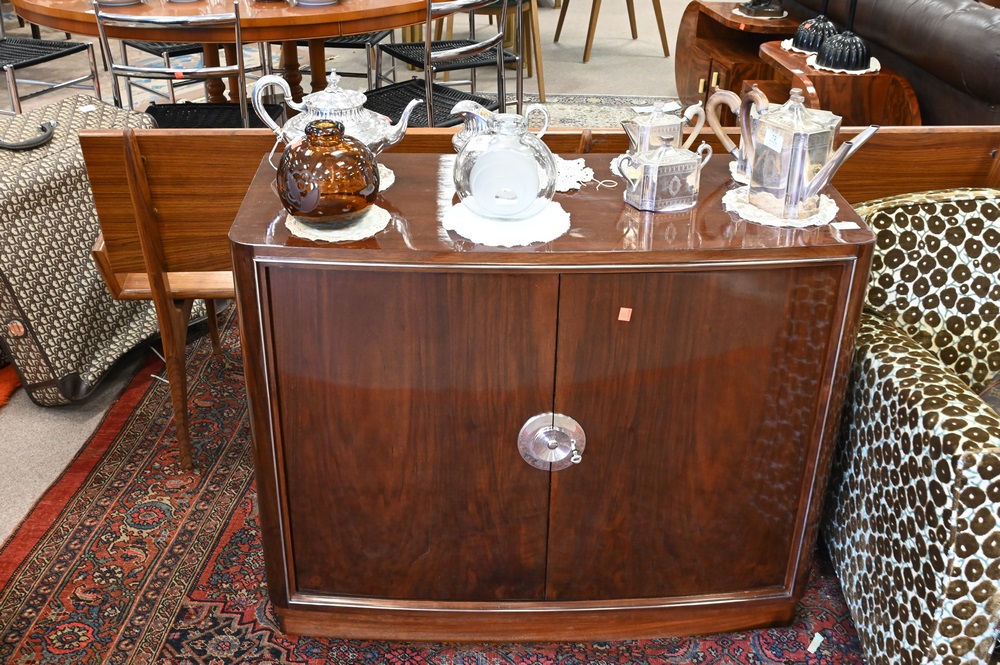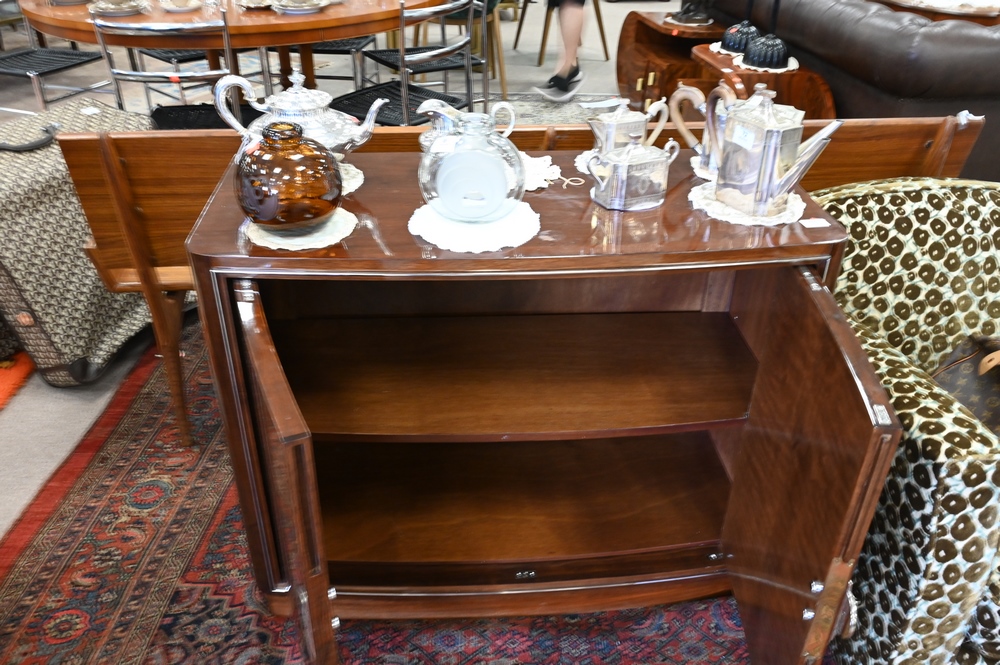 Lot 115: Dominique Paris French Two Door Art Deco Cabinet, having Dominique Paris brand on back, height 29 3/4 inches, top 17 1/2″ x 38″.