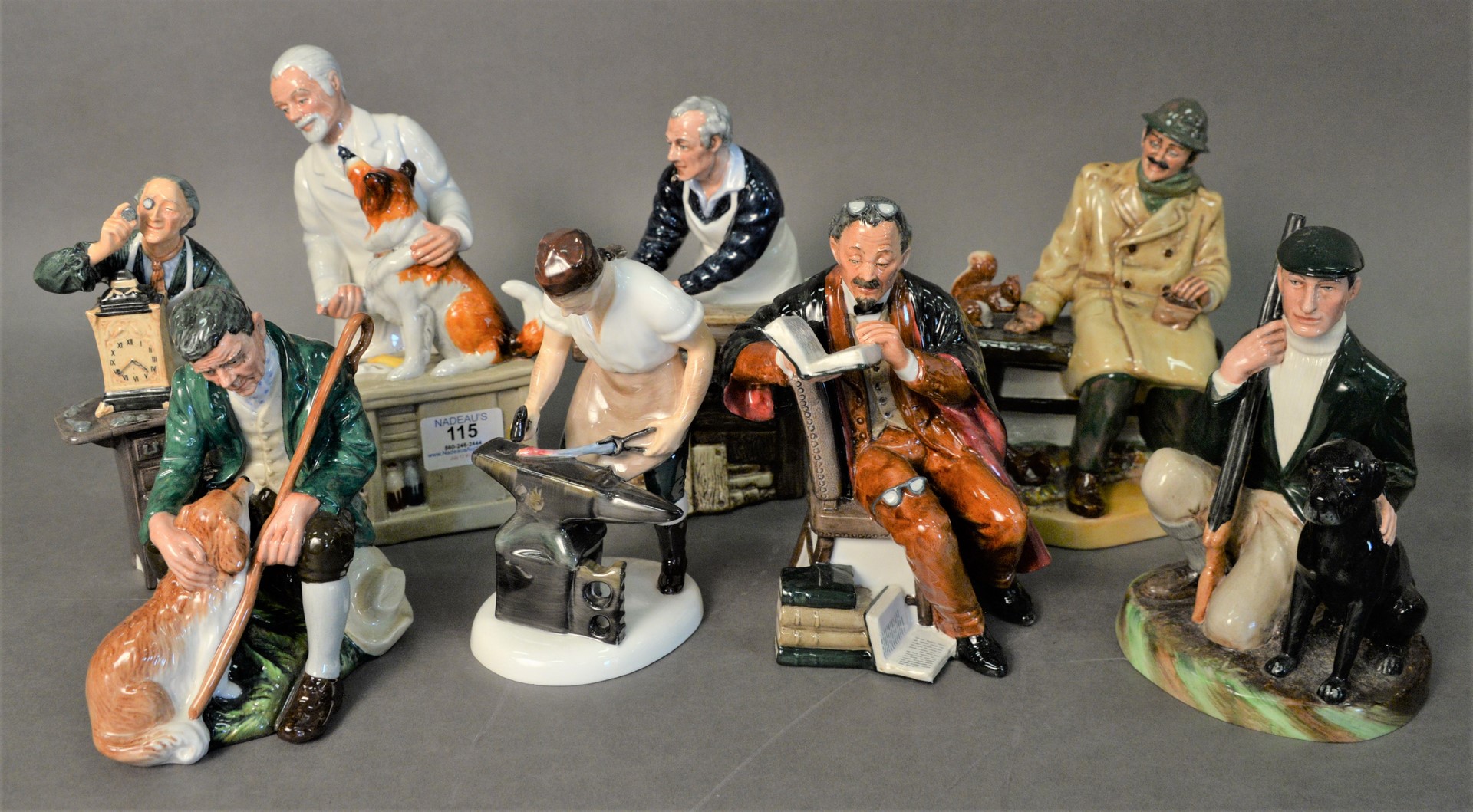 Eight Piece Group of Royal Doulton Porcelain Figures, to include “The Master”, “The Game Keeper”, “The Professor”, “Thanks, Dog!”, “Lunchtime”, “The Blacksmith of Williamsburg”, “The Clockmaker” and “The Carpenter”, all marked to the underside, height of tallest 8 1/2 inches. Provenance: Estate of James Wadhams.