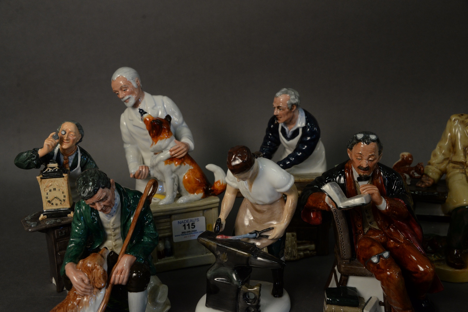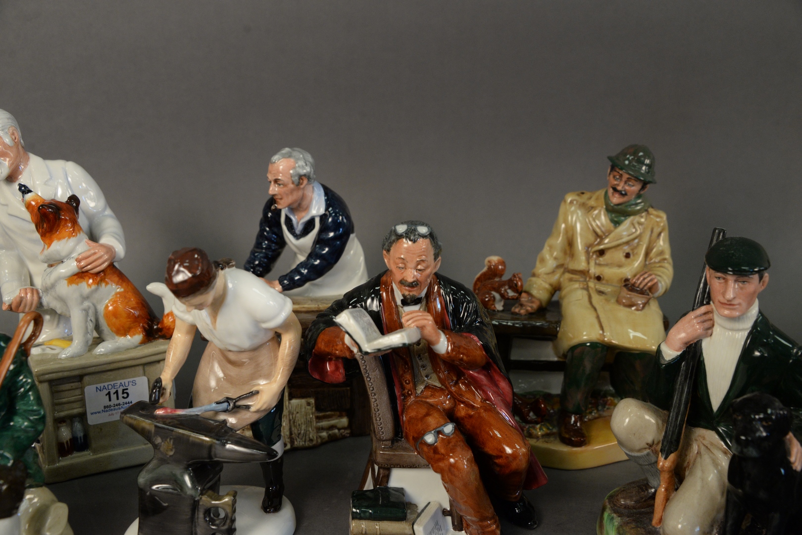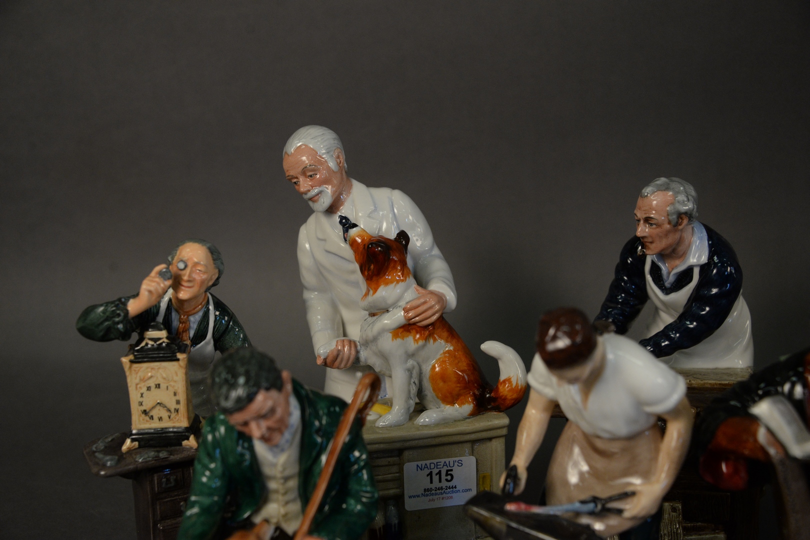 Lot 115: Eight Piece Group of Royal Doulton Porcelain Figures, to include “The Master”, “The Game Keeper”, “The Professor”, “Thanks, Dog!”, “Lunchtime”, “The Blacksmith of Williamsburg”, “The Clockmaker” and “The Carpenter”, all marked to the underside, height of tallest 8 1/2 inches. Provenance: Estate of James Wadhams.