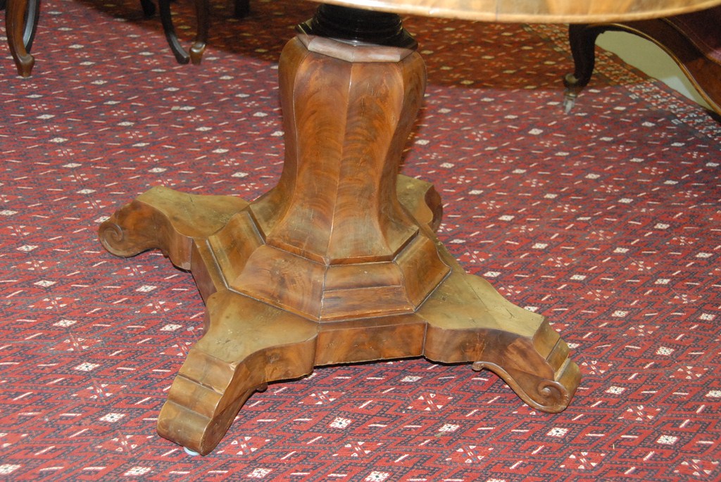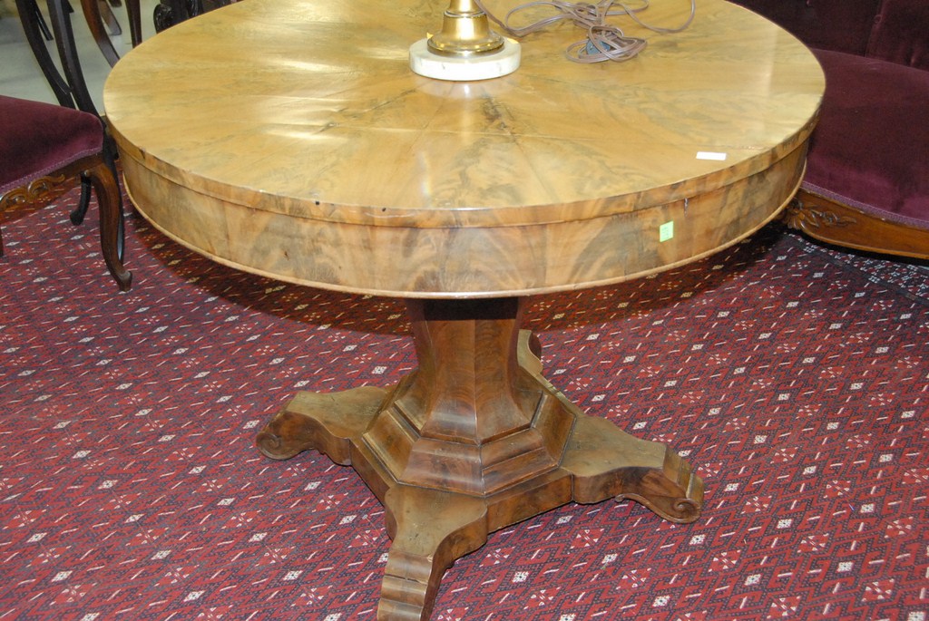 Empire round mahogany center table, sun faded ht. 30:, dia. 37.