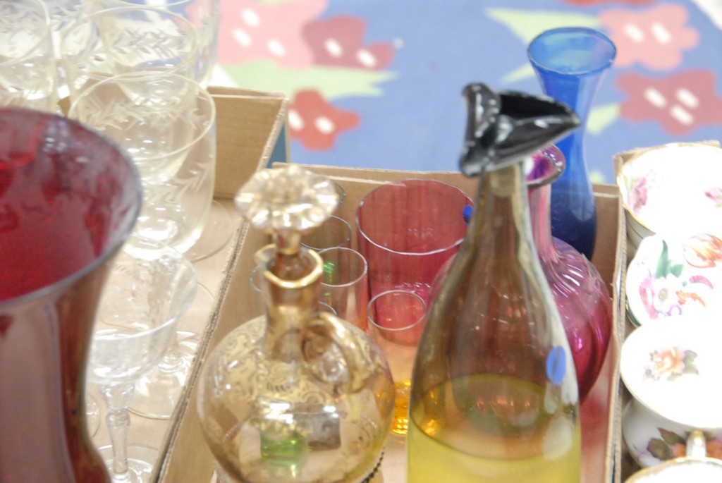 Five box lots crystal stems, decanters of various colors etc. one decanter with a face and hat.