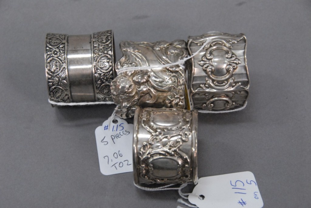 Five piece lot four sterling silver napkin rings and one skewer, 7 troy ounces.