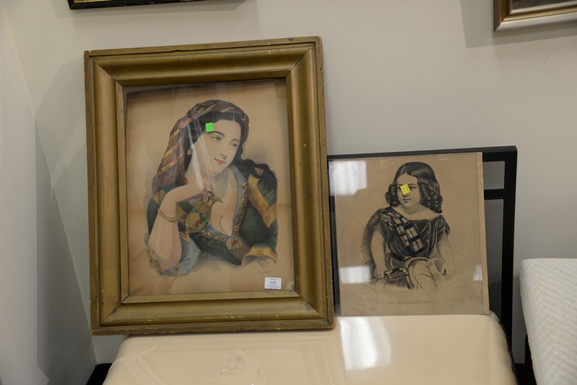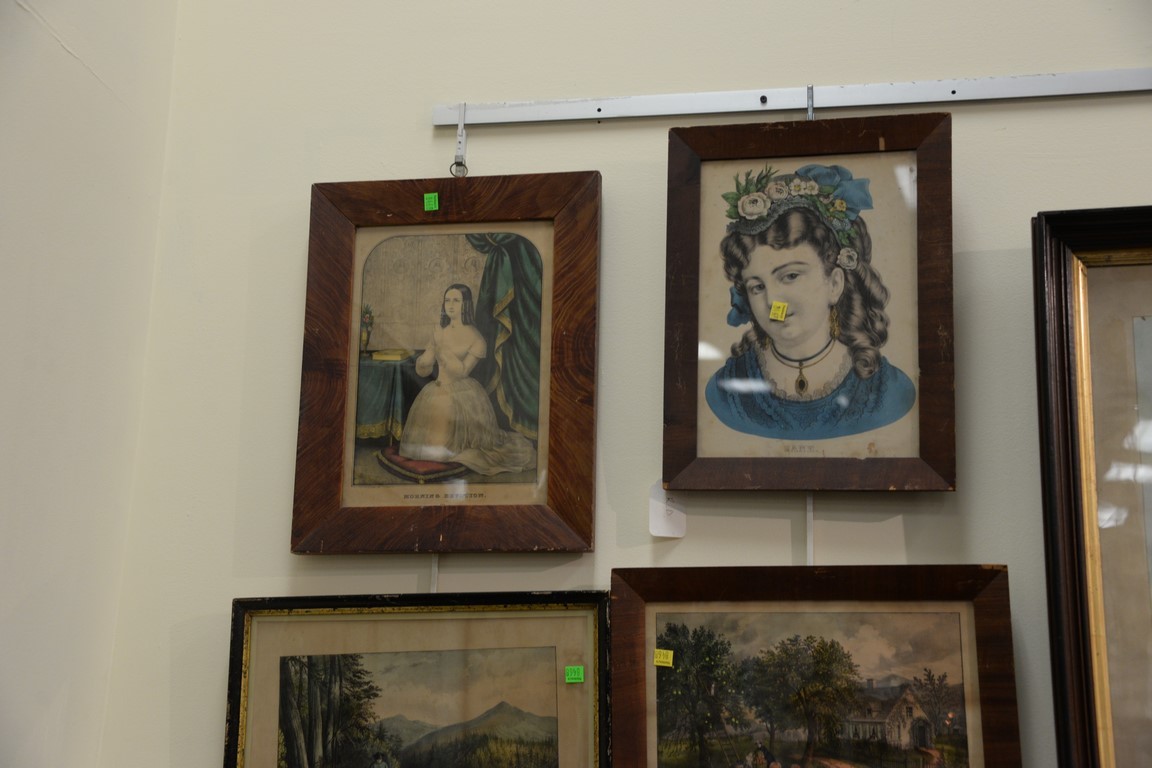 Lot 115: Group of eight Currier colored lithographs in period frames including a grain painted including large lithograph of Woman with a B…