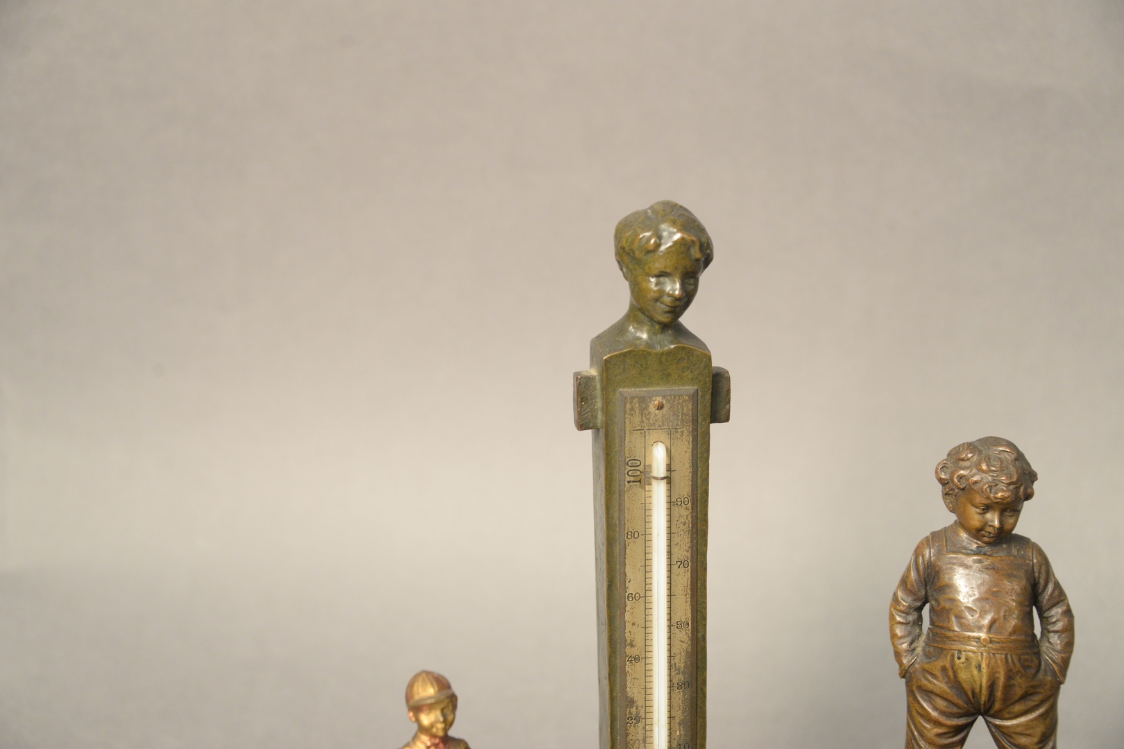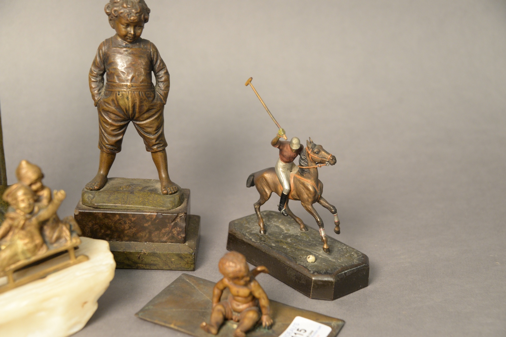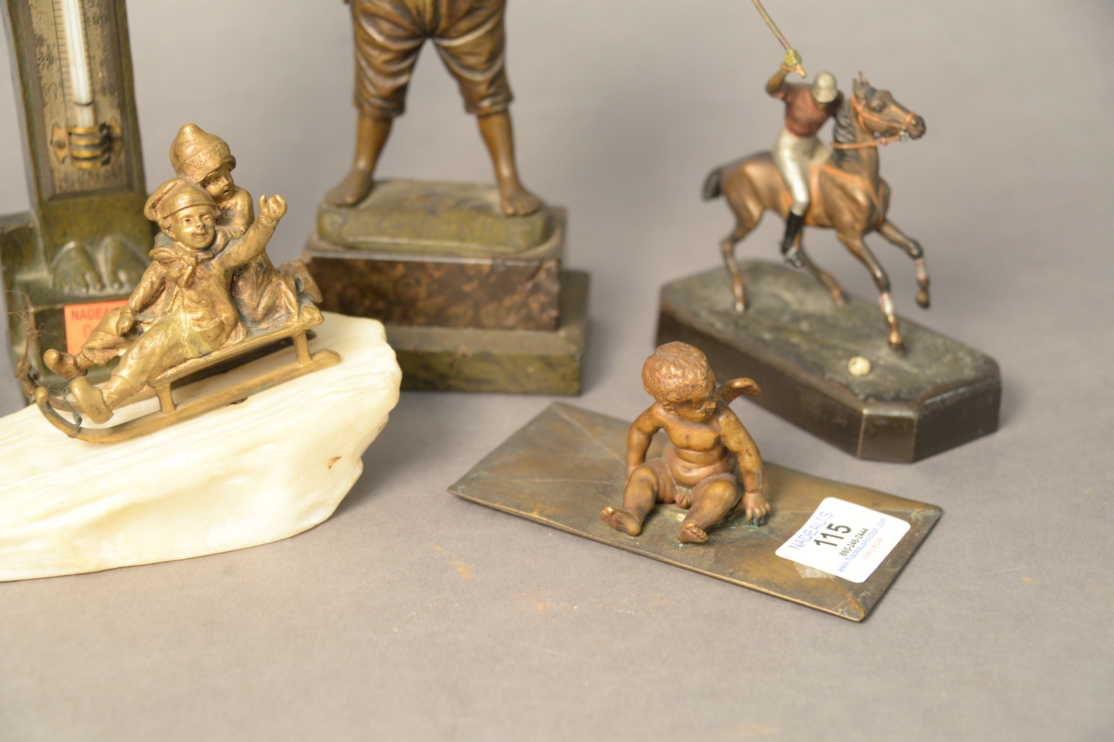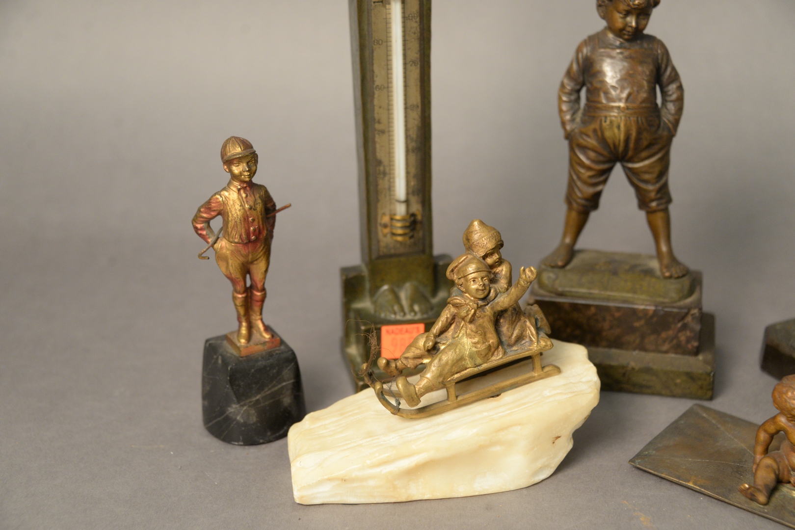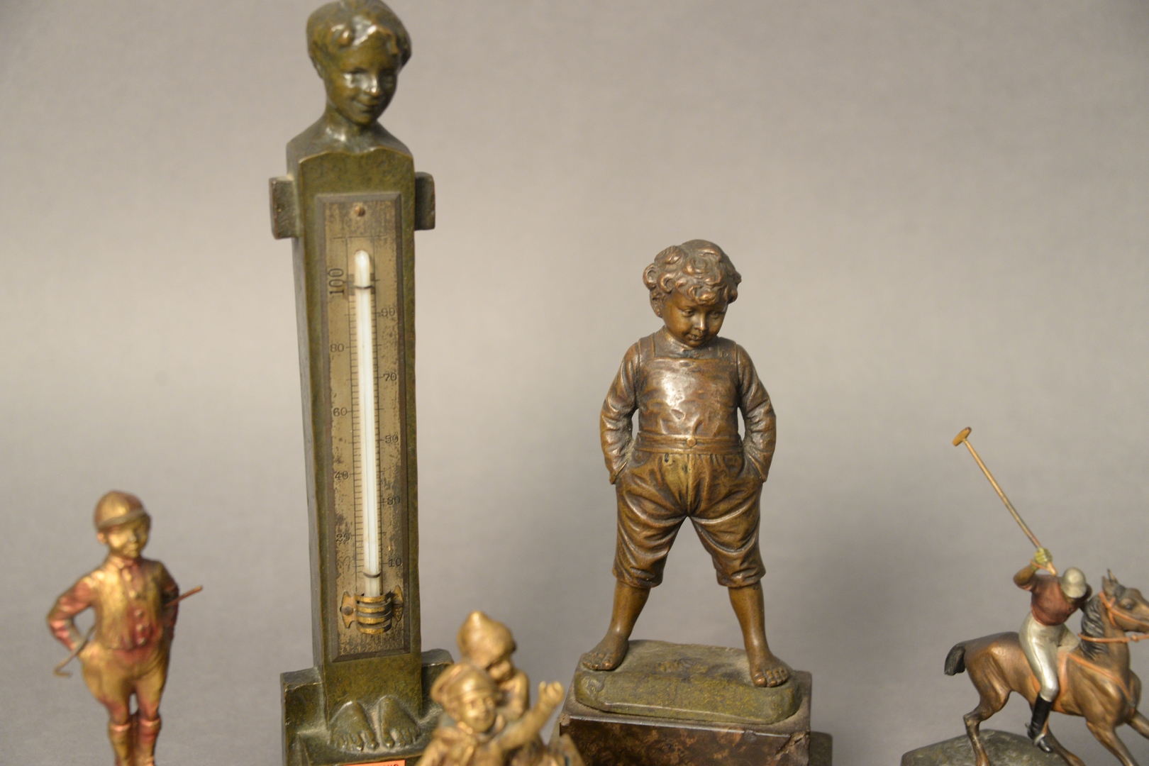 Lot 115: Group of Six Sculptures, to include P. Kowalczewski, Sleigh Ride standing bronze boy, signed illegibly polo player on horse Arts and Craft thermometer, marked LMS heights 2 – 11 inches.