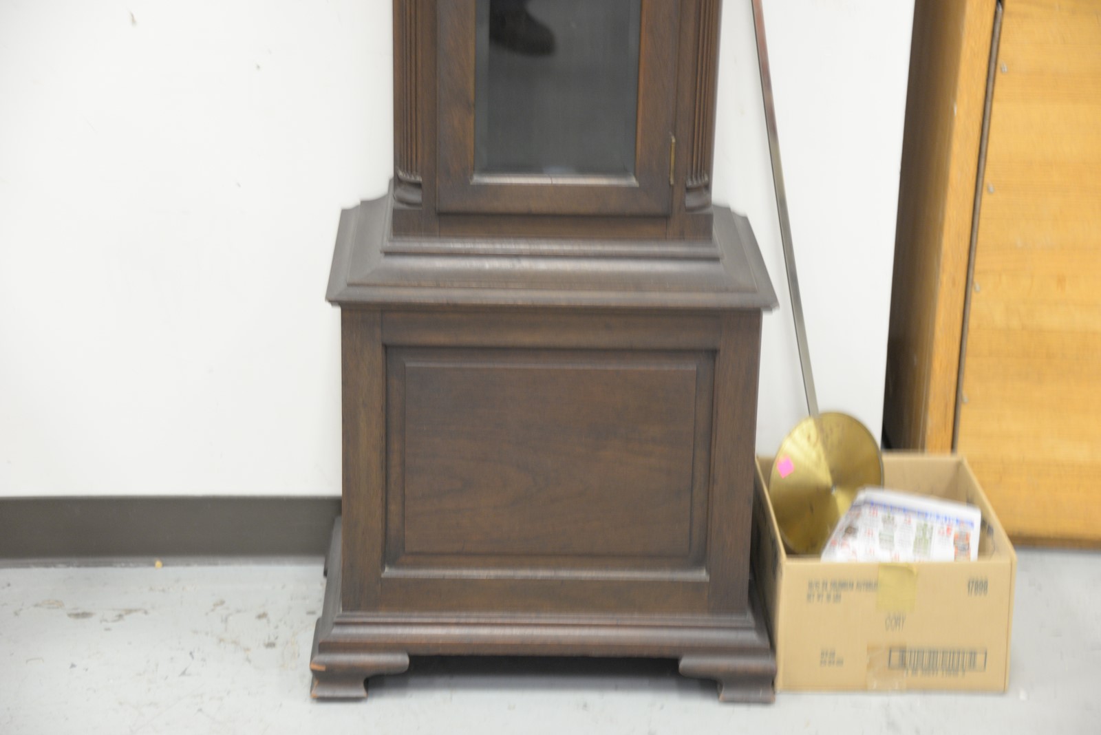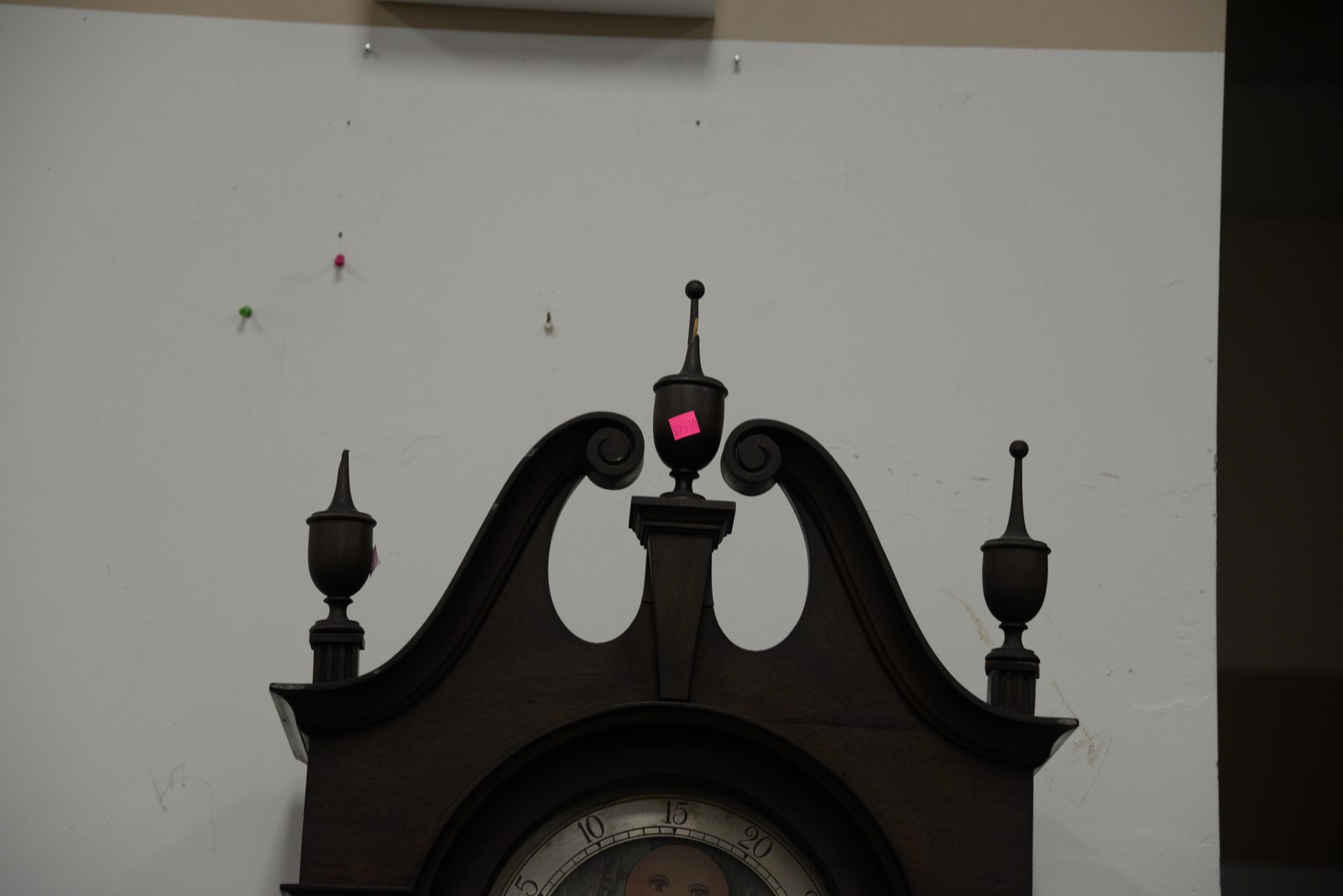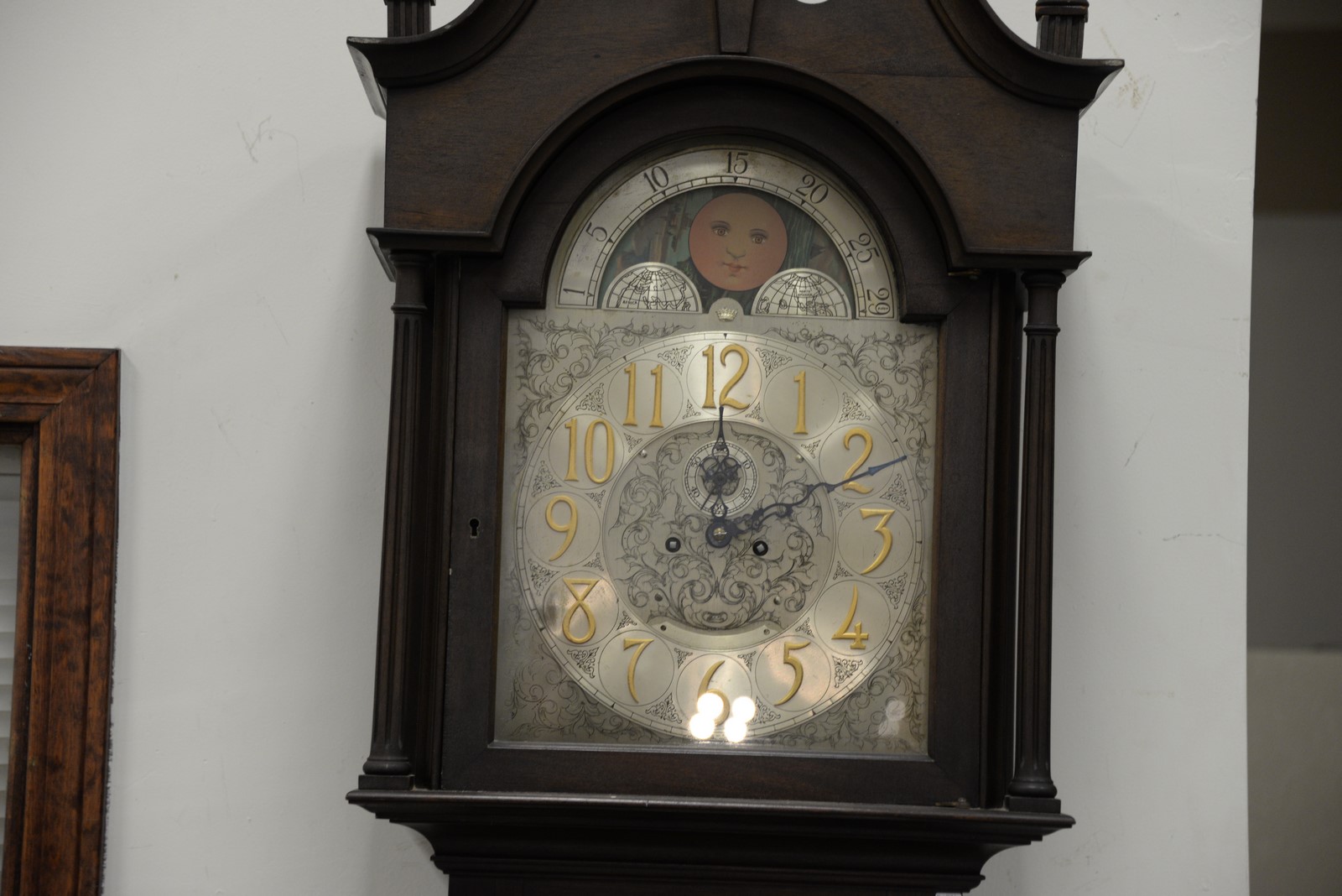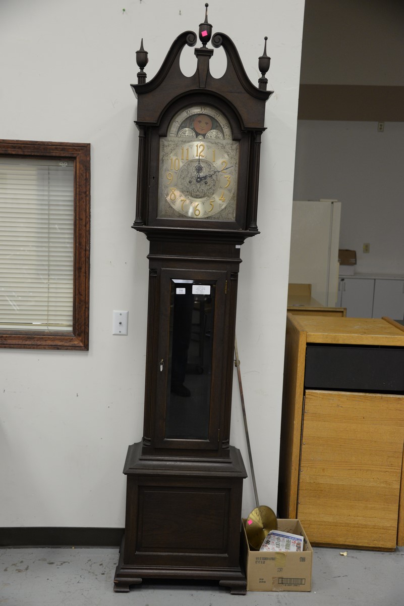 Herschede mahogany tall case clock two top finials as is. ht. 93 in. wd. 20 in. dp. 13 in.