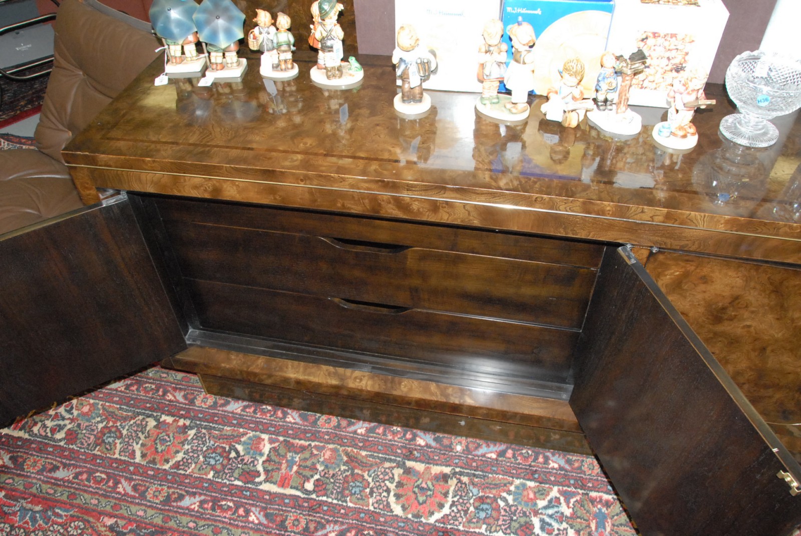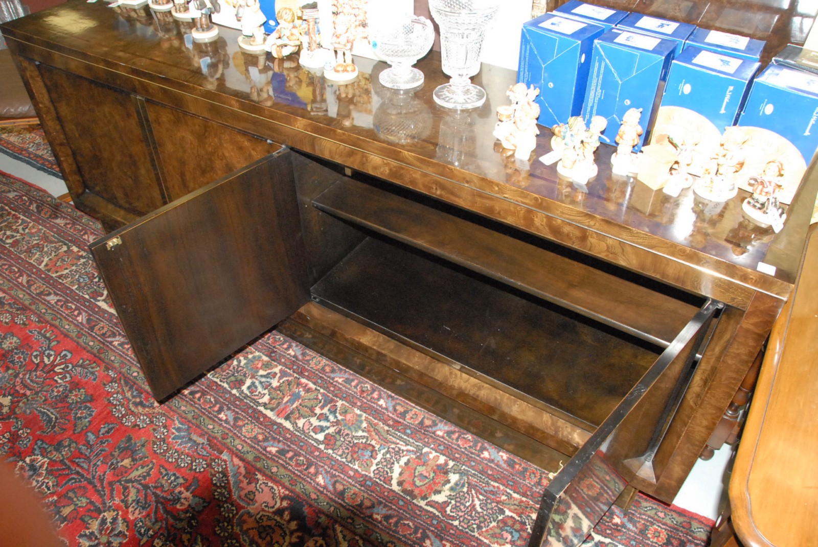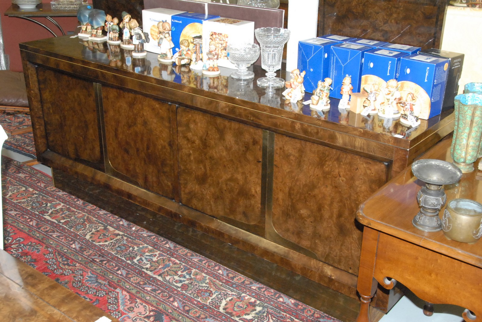 Large Burlwood dining room table with two leaves and pads, also Burlwood sideboard with four doors